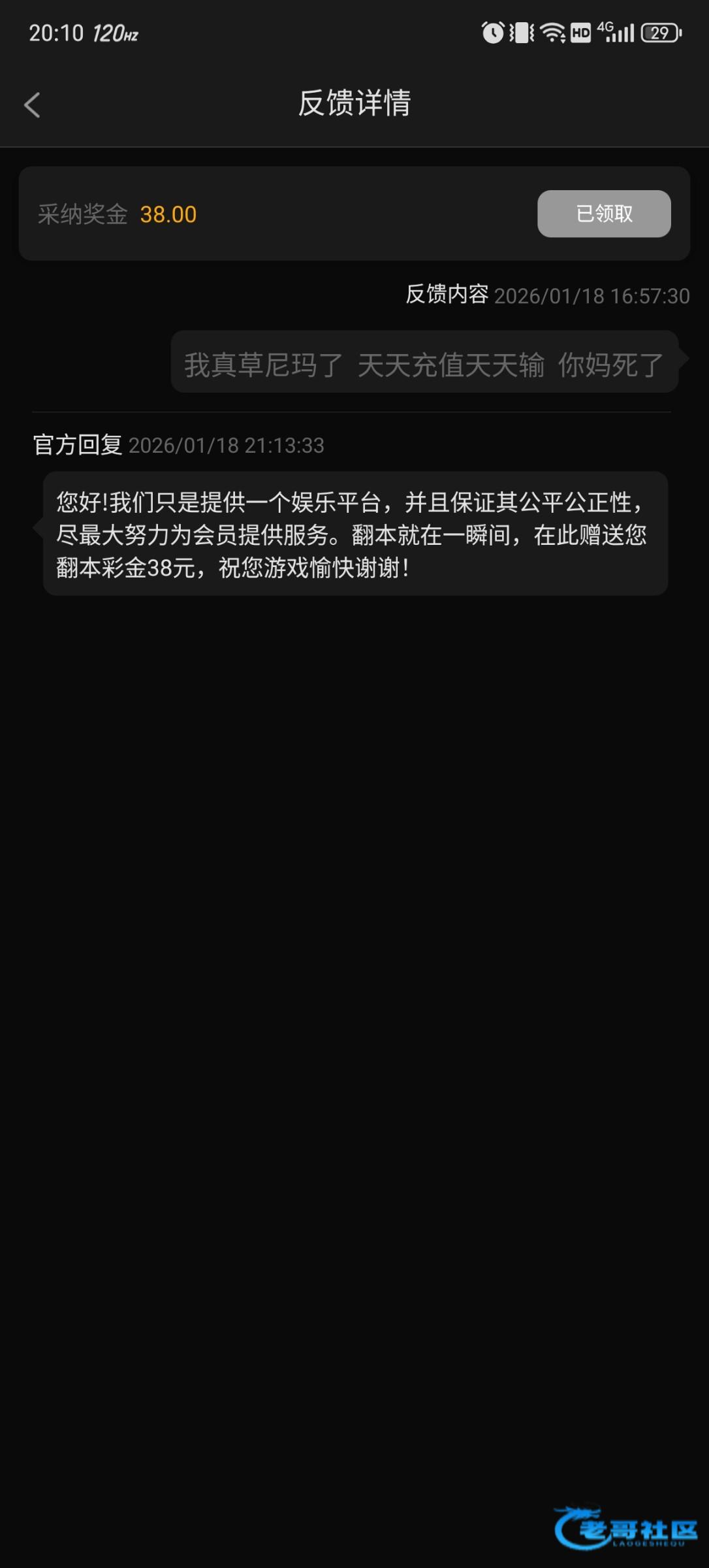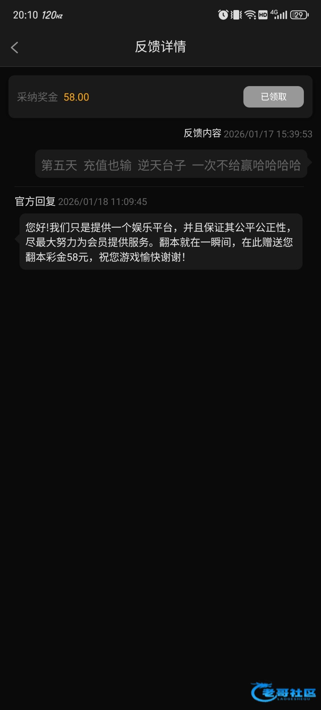 在1158新葡京输钱的可以去有奖反馈里吐槽一下 我吐槽两次一次38一次58 我也不确定是不是每个人都有 审核挺慢的 试试不一定有 不试一定没有