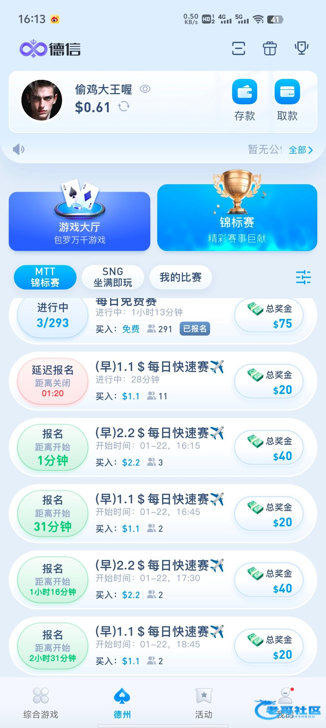 这个每天有四场免费赛,12点,3点,6点,9点,只要打出够1.1u,就去打每日快速赛1.1,2.2的比赛这个基本没什么人报名玩,最多10人进,只要稳一点基本可以吃前三名,够50u就可以提了,我打了两天已经到账50,白嫖即可不要充值官网DX.vip
