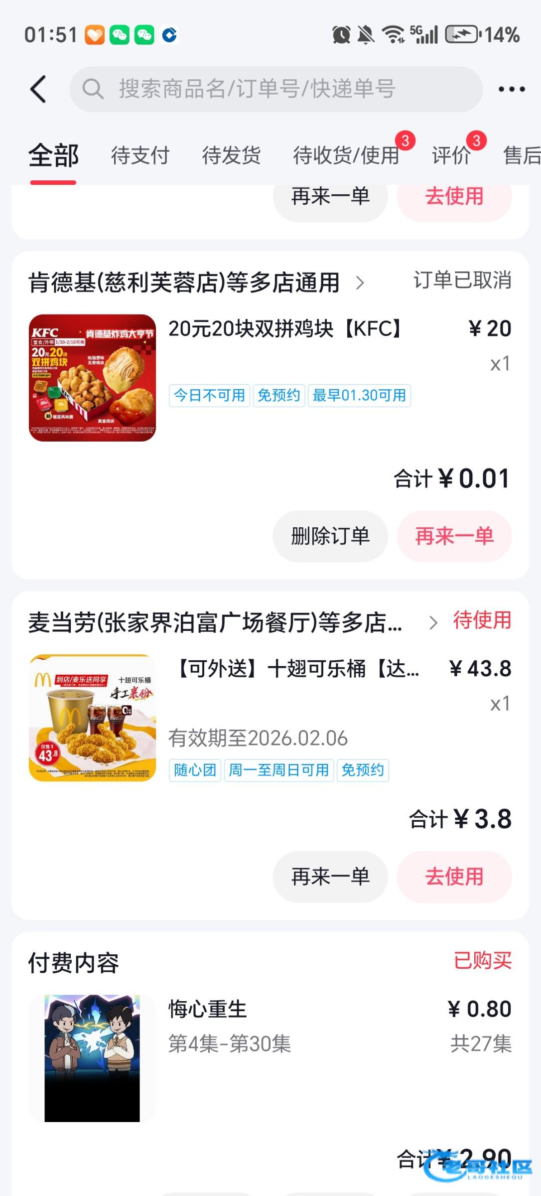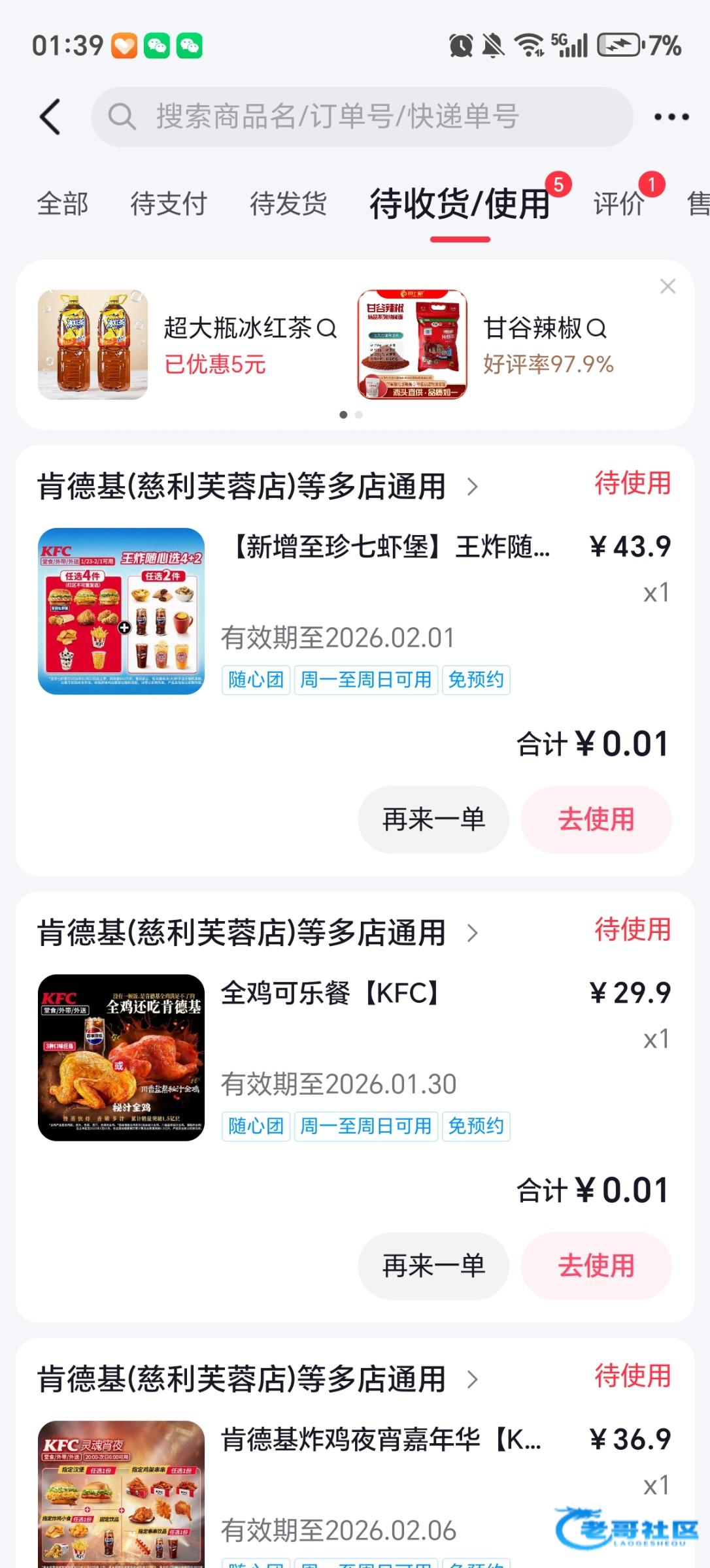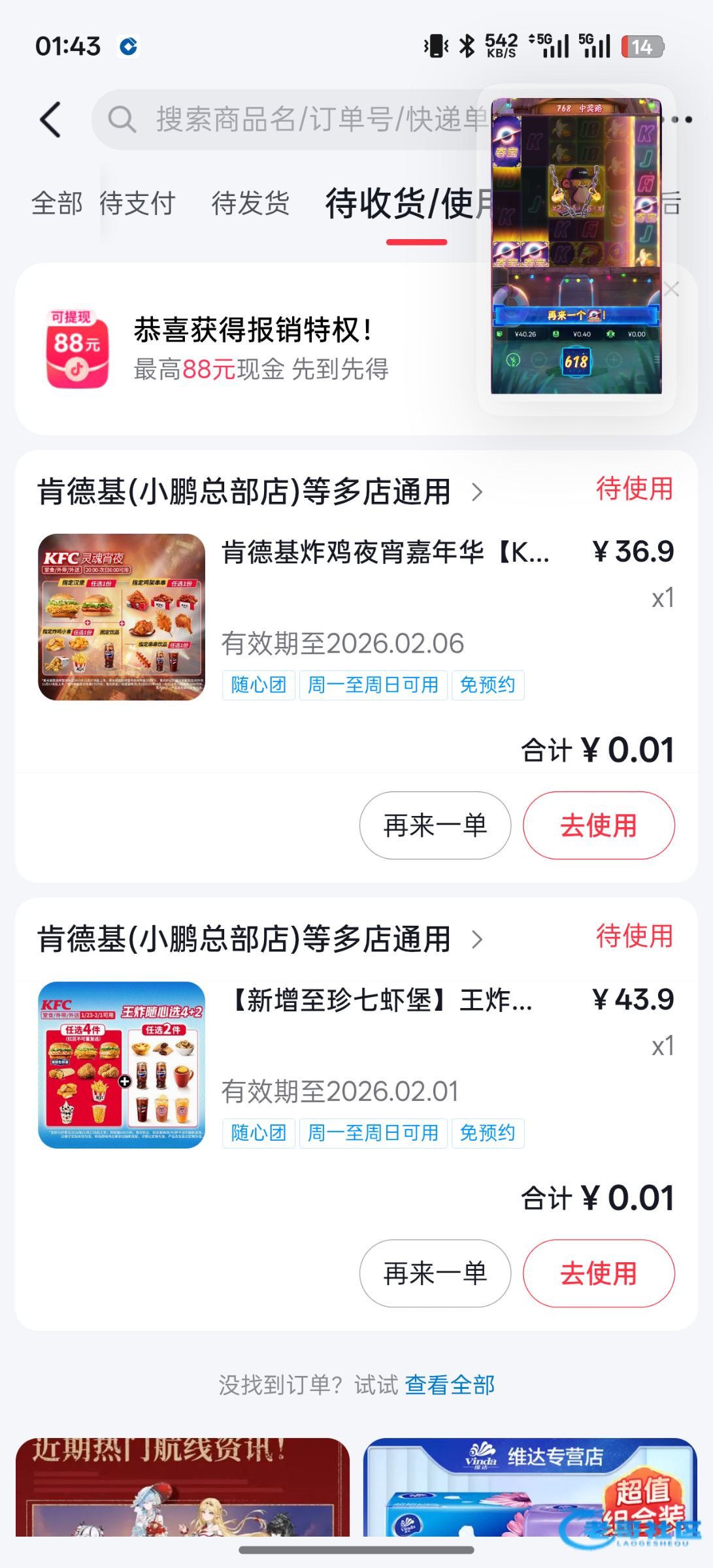 进抖音搜索肯德基。在直播界面如果显示0.01直接买。 没有就换号。