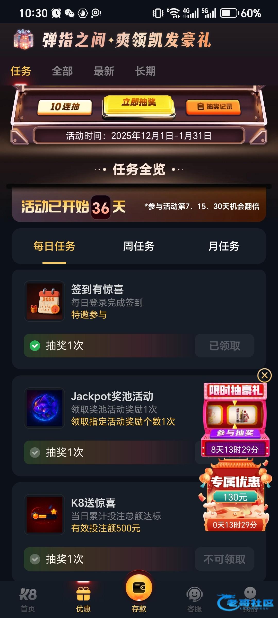 登录账号,我图里这个限时抽好礼,点进去,每天都可以签到(签到之前随便点个电子进去不用玩过几分钟再回这个界面就可以签到),基本就是三种奖品,红包或者pp免费旋转或者百家乐门票,都有用。很久没充值过一个月一直在白嫖,pp那个爆奖也有几十,然后自己去打过关啥的,我今天今天十多块又打上400,有号的可以看看自己有没有这个活动,不知道是不是都有。网址k8.com