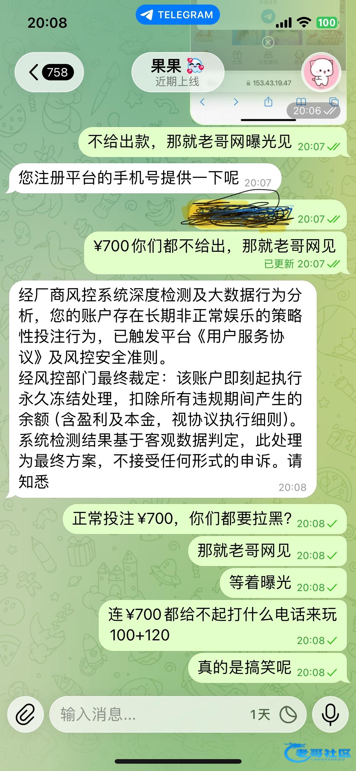 打电话来100+120,流水打够了正常投注,盈利了打到713提现,第一次提u拒绝,第二次提钱包账号异常