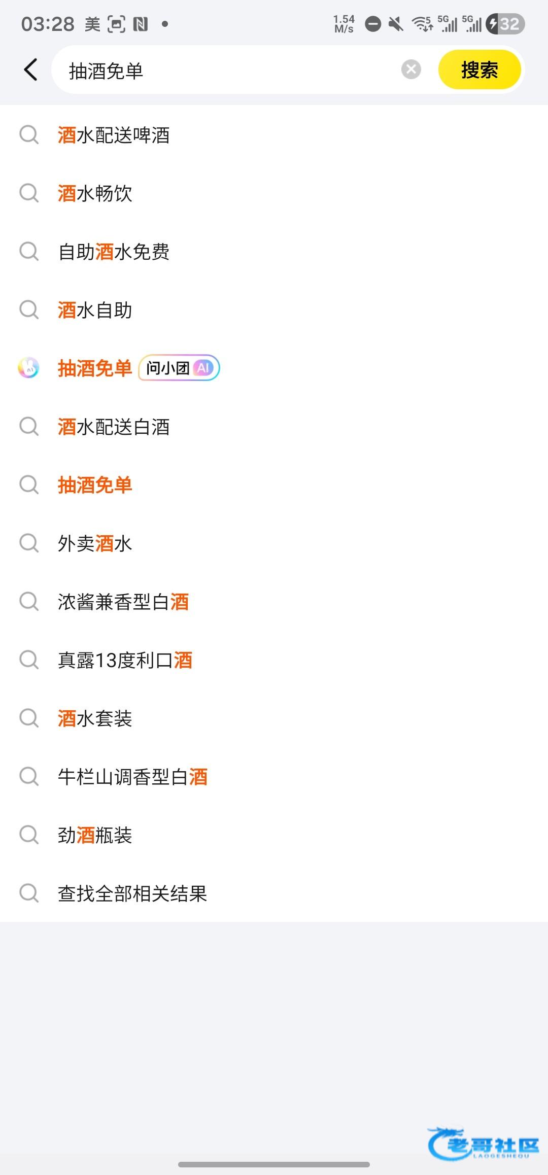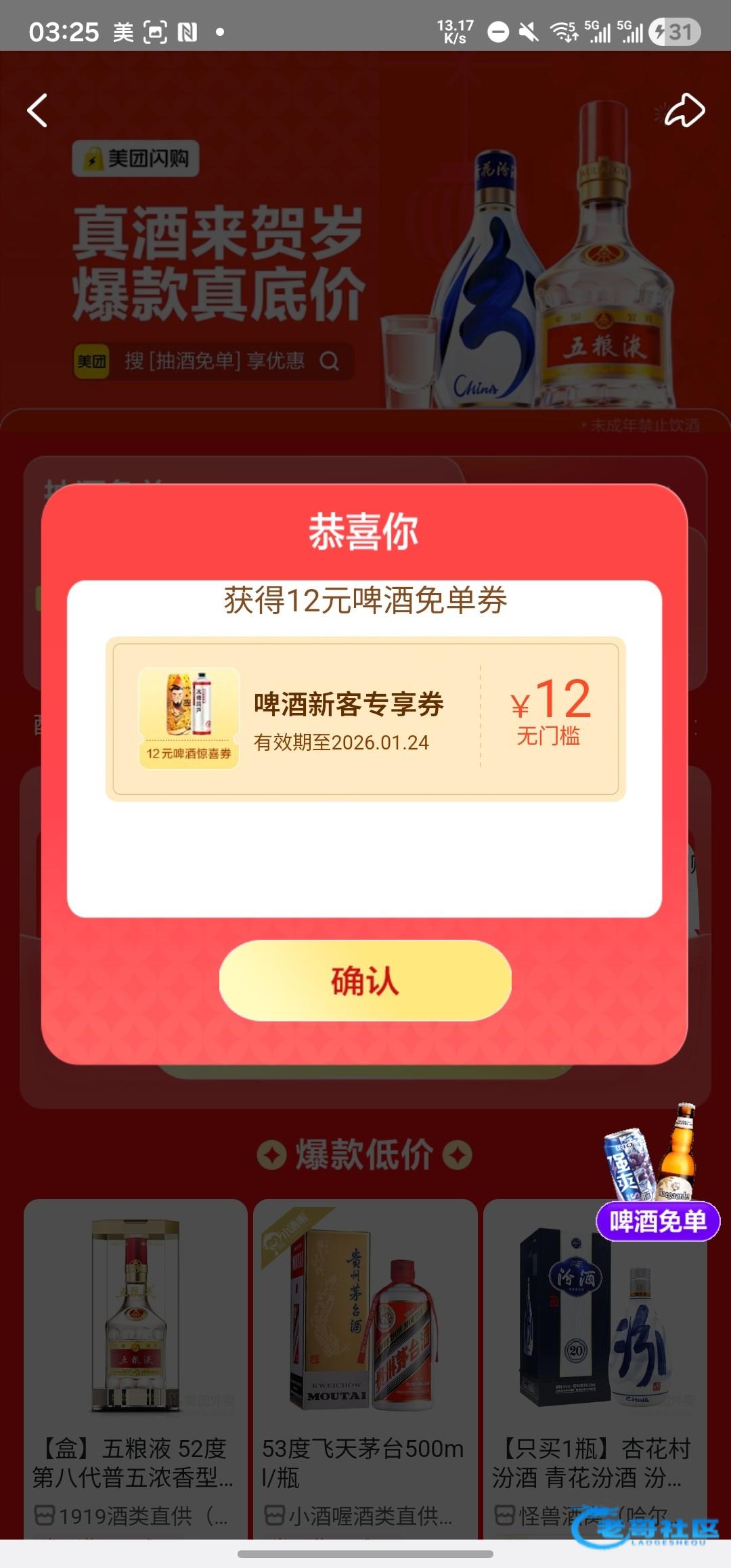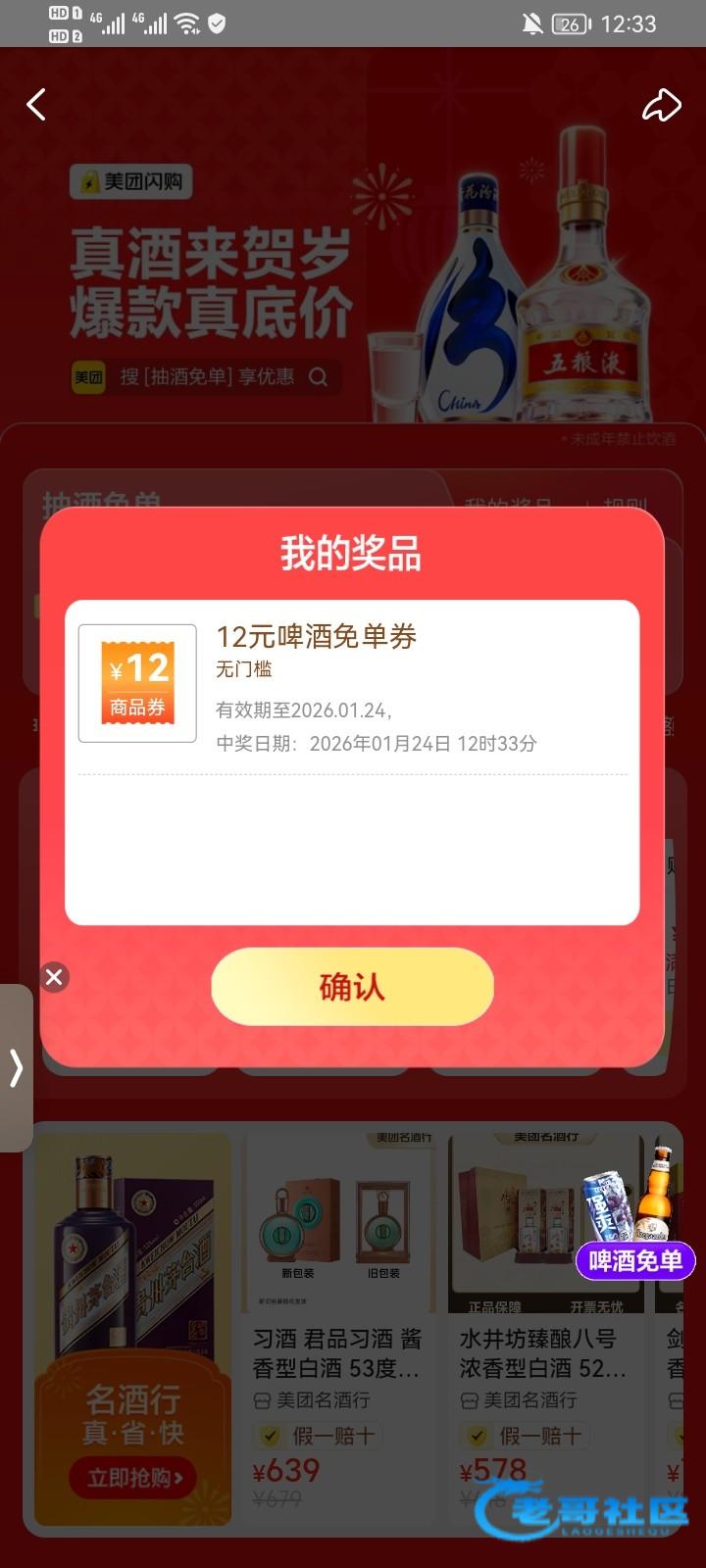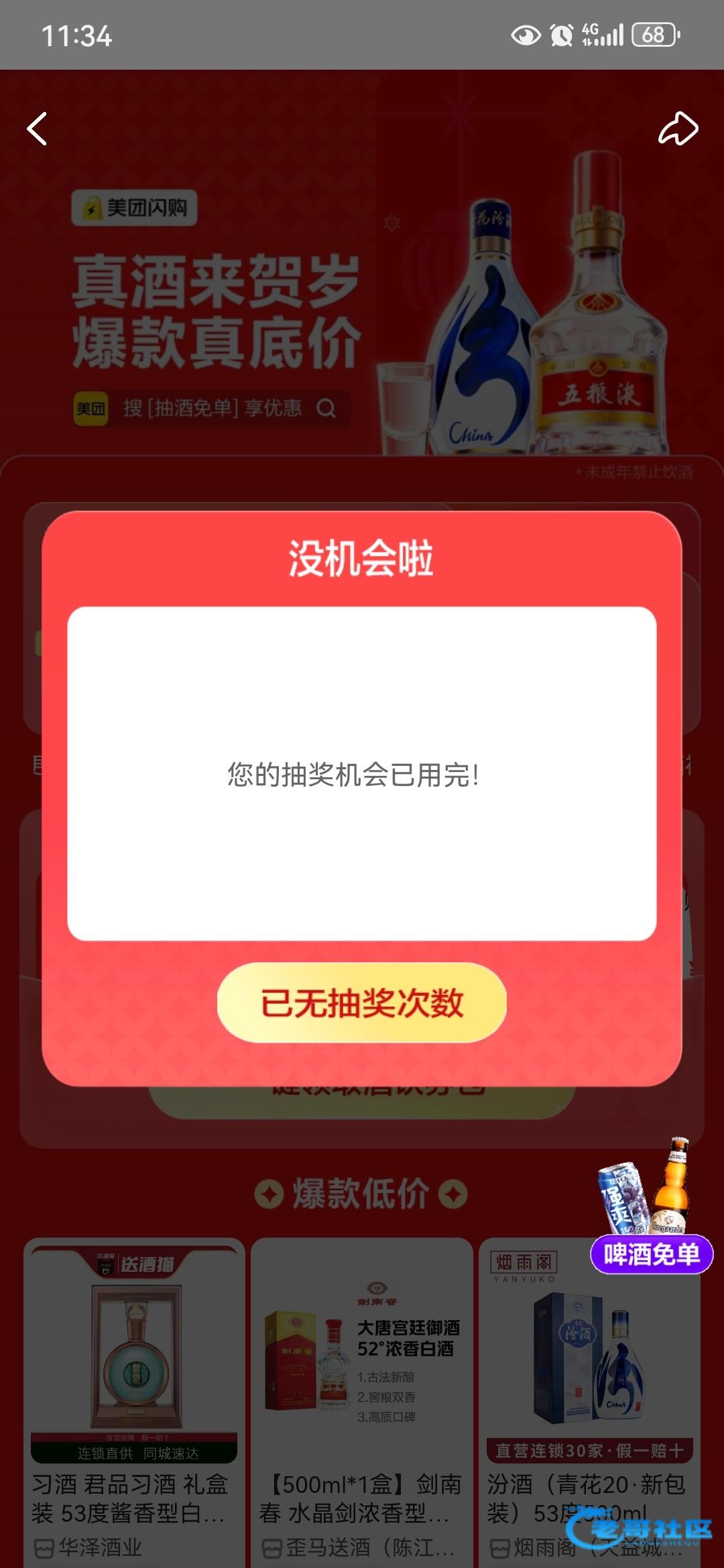 美团app首页搜索抽酒免单进入活动界面,有无限次的机会,可以中五粮液,基本都是12减12,可以半夜渴了买点啤酒喝解解渴。