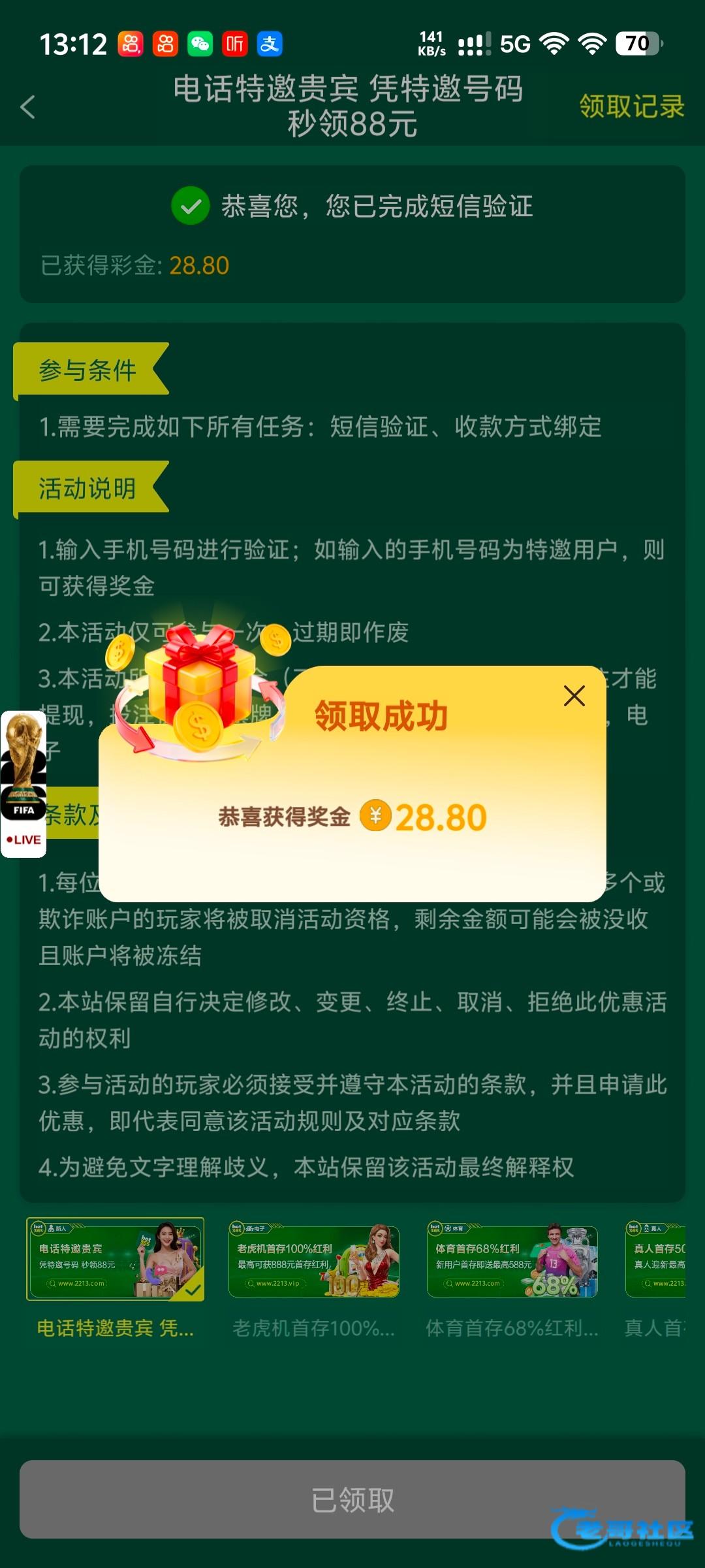 接到电话说送88彩金 送了28我没打出来 打出来的老哥团个饭呗链接www.22131111.com