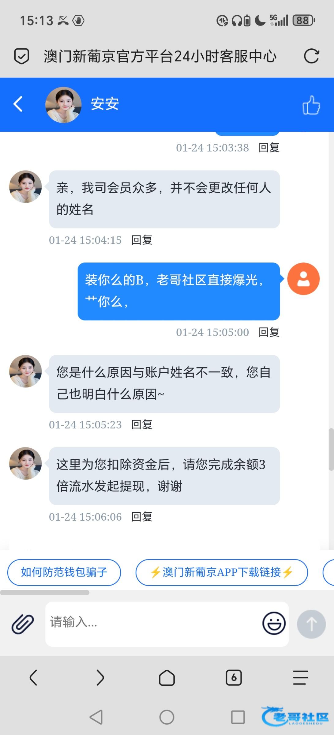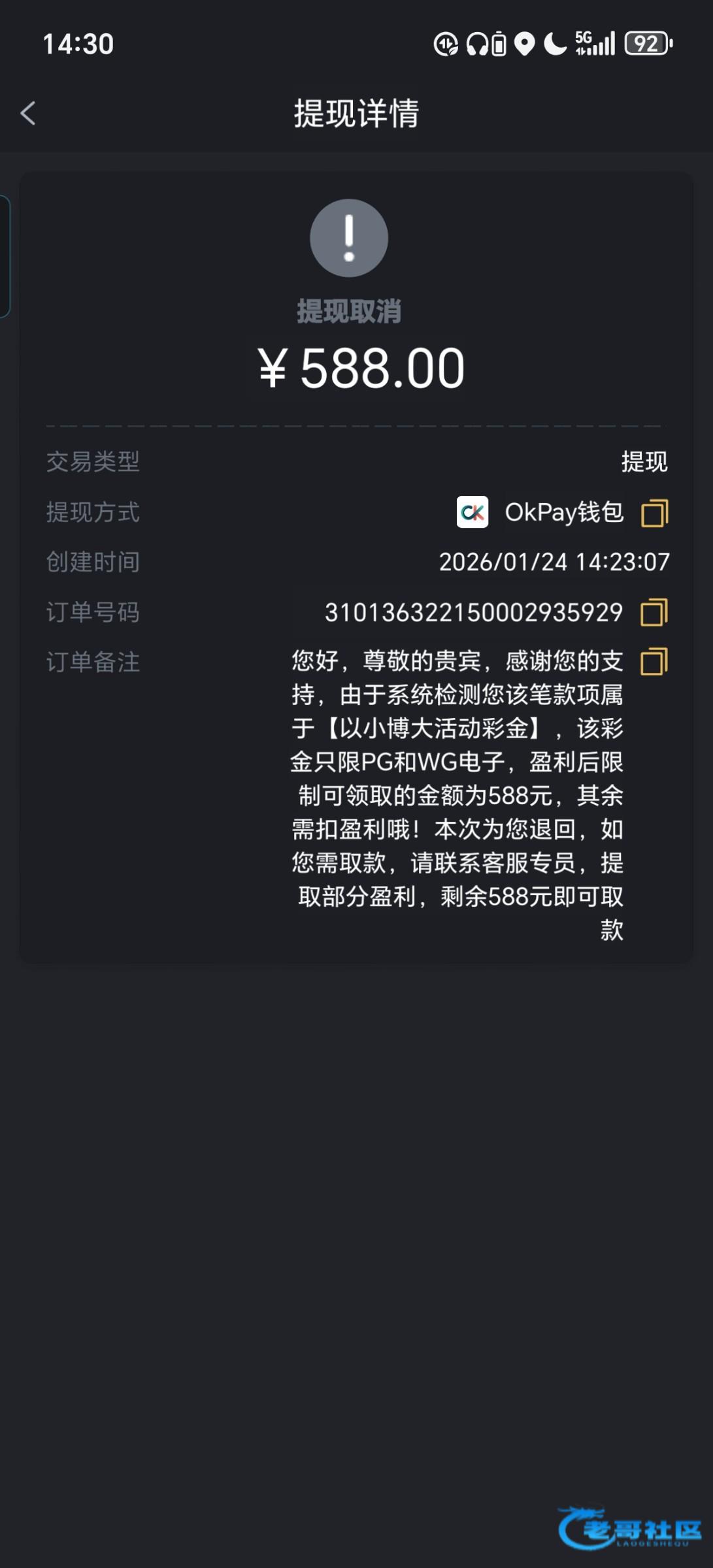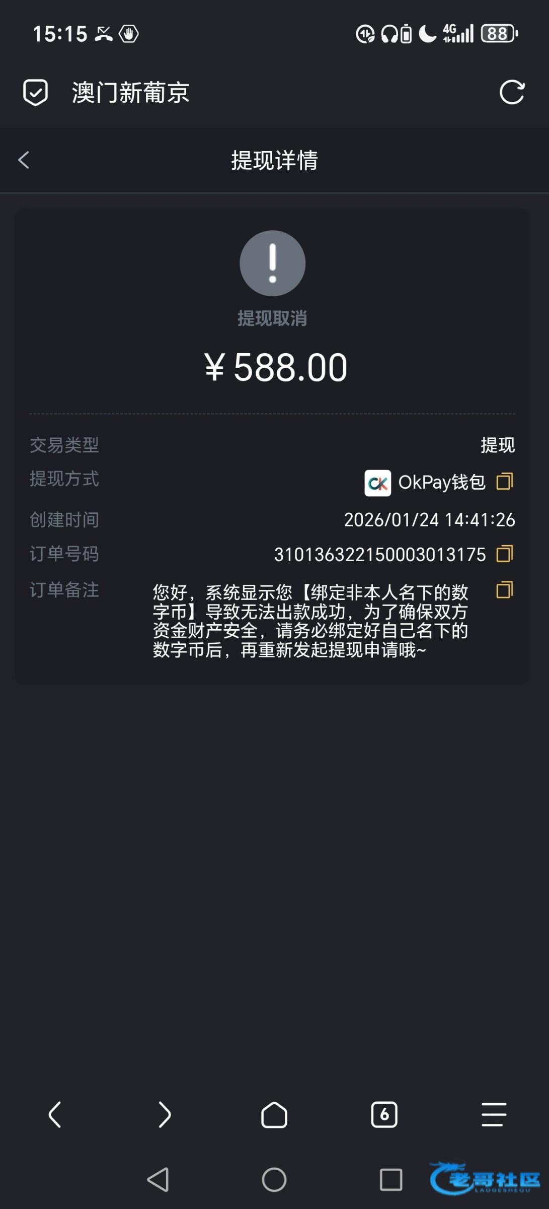 今天参加5668以小博大,提了588,用okpay充值,也提现,后面扣除,提前失败!平台以改名字,故意问我为什么名字不一样,,黑B台!