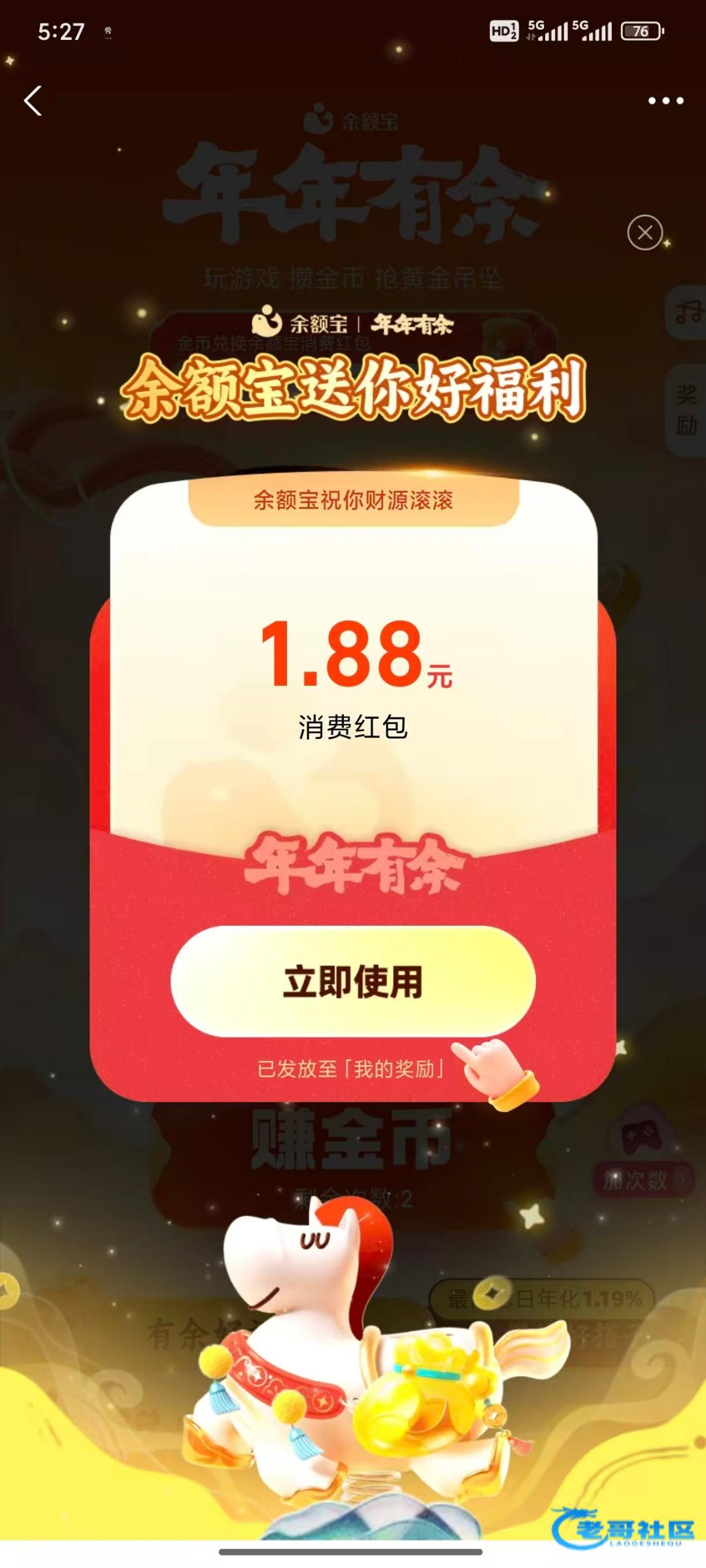 点进去余额宝下方这里有一个天天有鱼点进去 运气好的直接有消费红包 然后点那个去游戏 游戏结束一般都是三四千的积分,然后它会出现一个暴涨,直接去报账就行了,大概就是从银行卡转100到余额宝 然后1万积分等于一红包,把任务做完,保底三四块