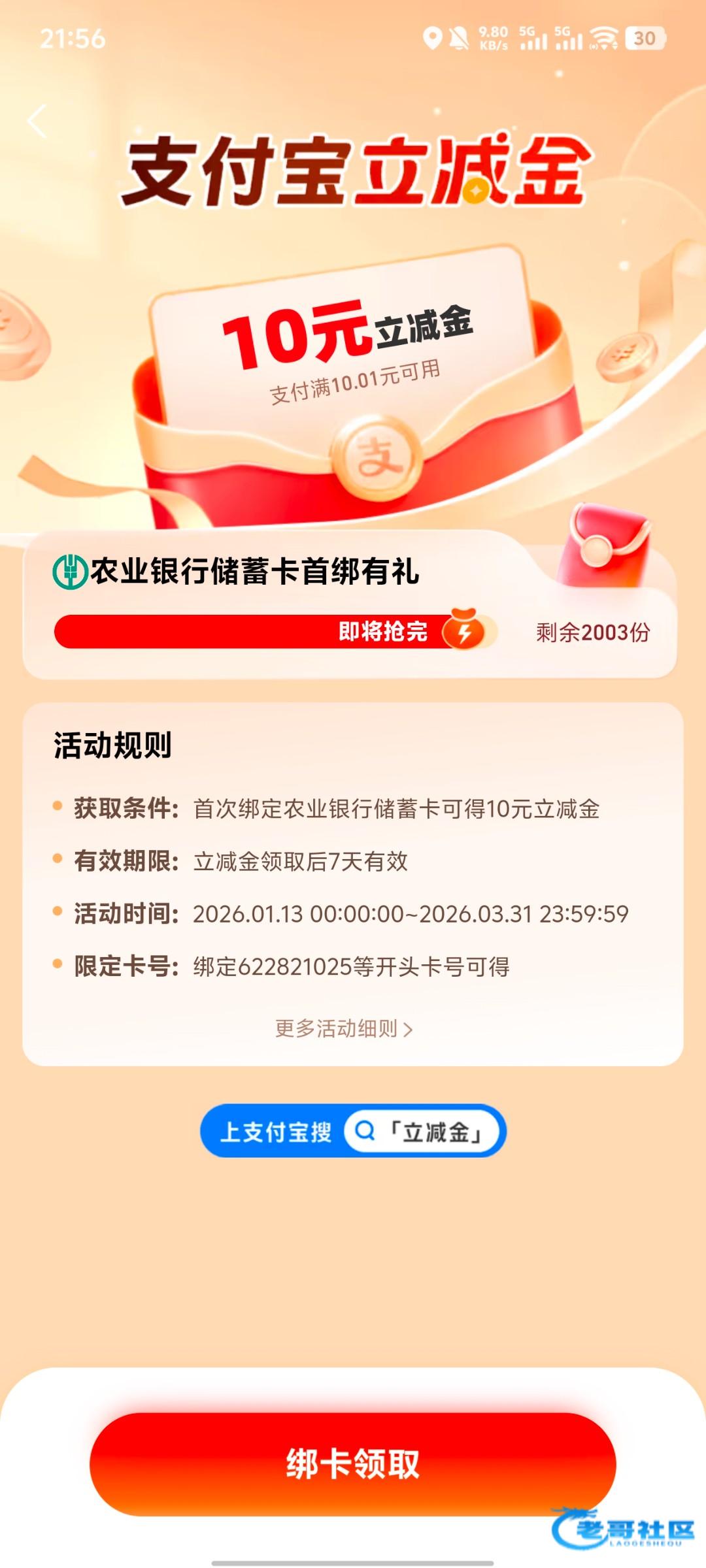 不啰嗦上主题,今年支付宝更新了农行支付宝立减金地区卡领取,分别是杭州11元娄底10元内蒙古8元北京8元,全程5分钟可以得37元秒到账