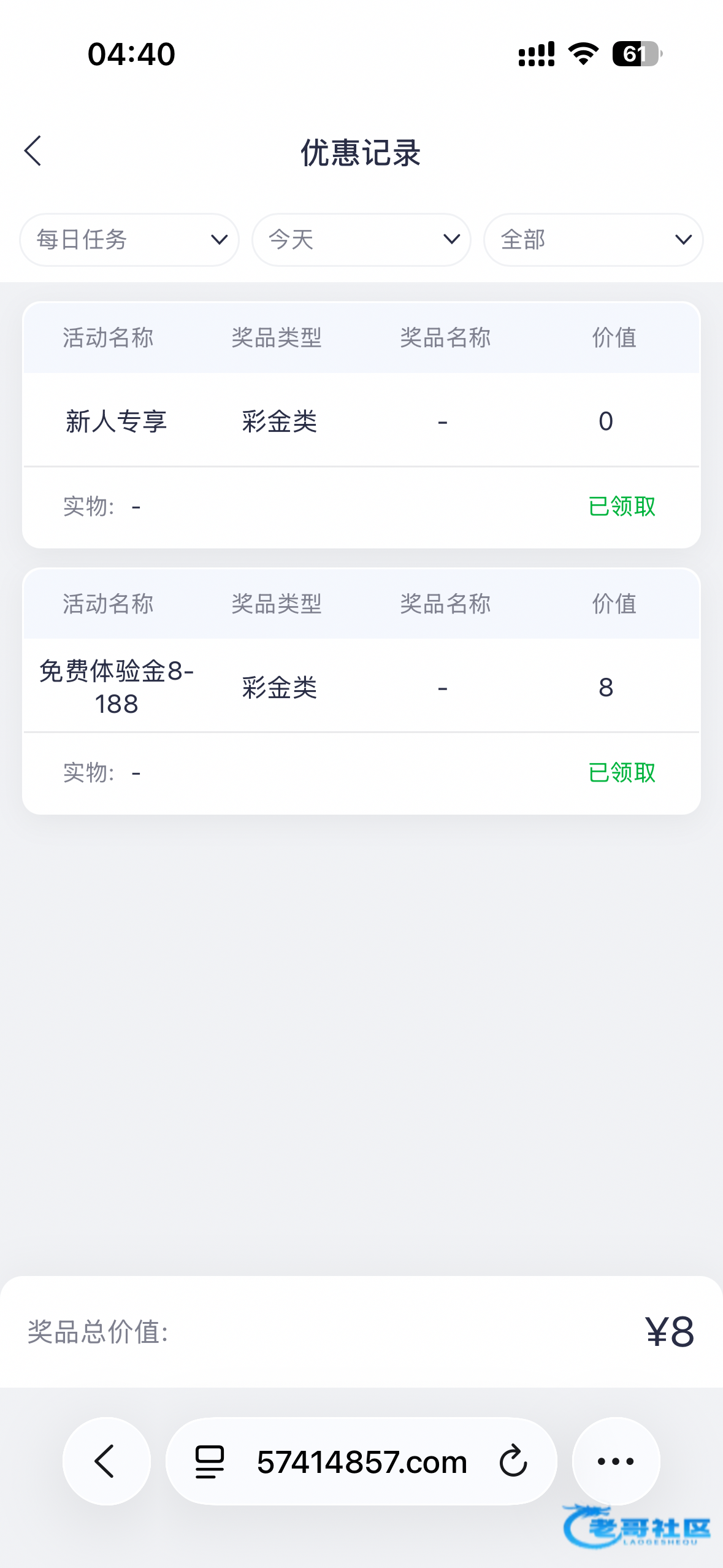 昨天下午注册的 本来想着第二天领彩金