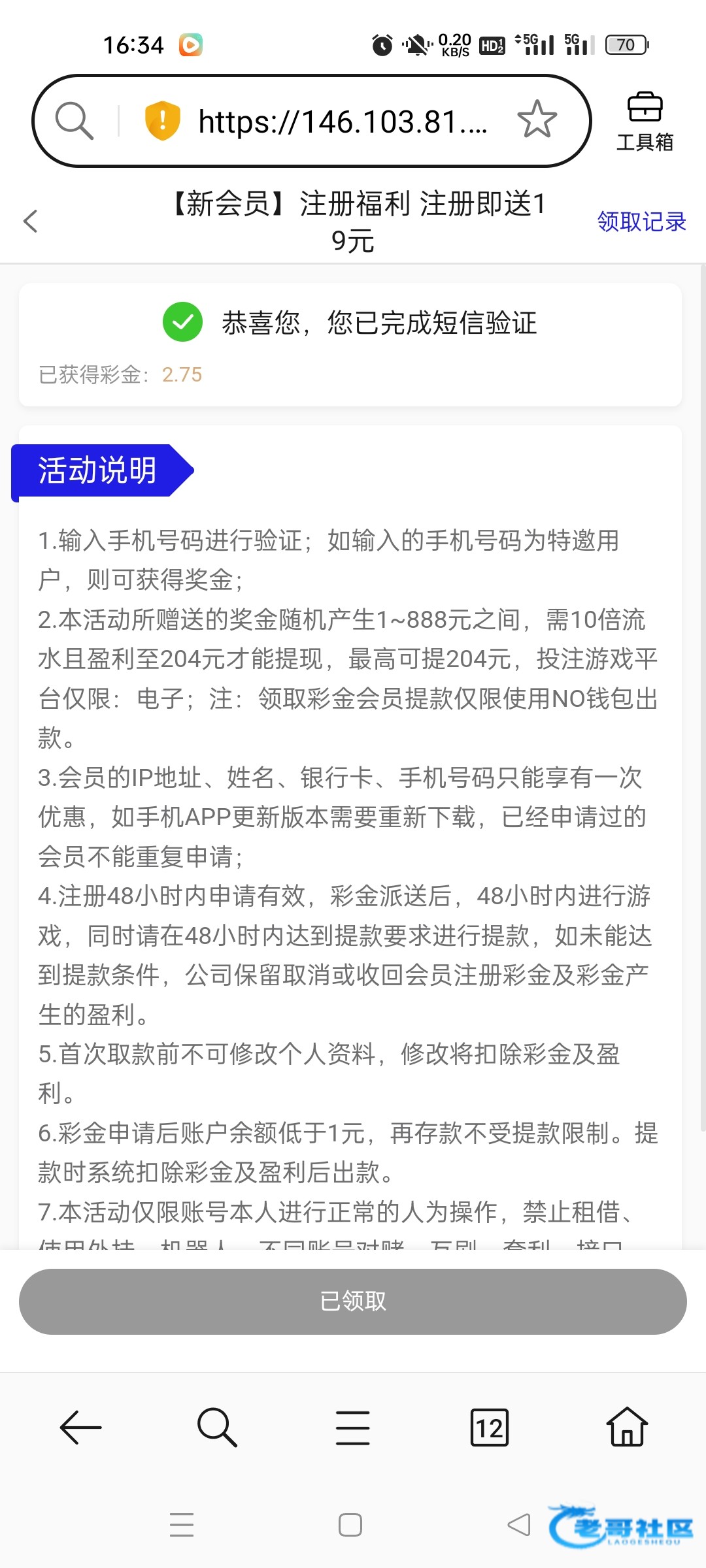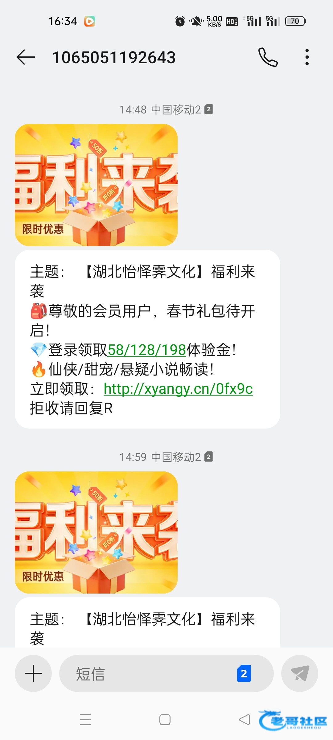 短信特邀,特么1分钟发两个短信来,说送58.128.198。然后进去看活动,说注册送19,然后下面又说奖金1到888,真是