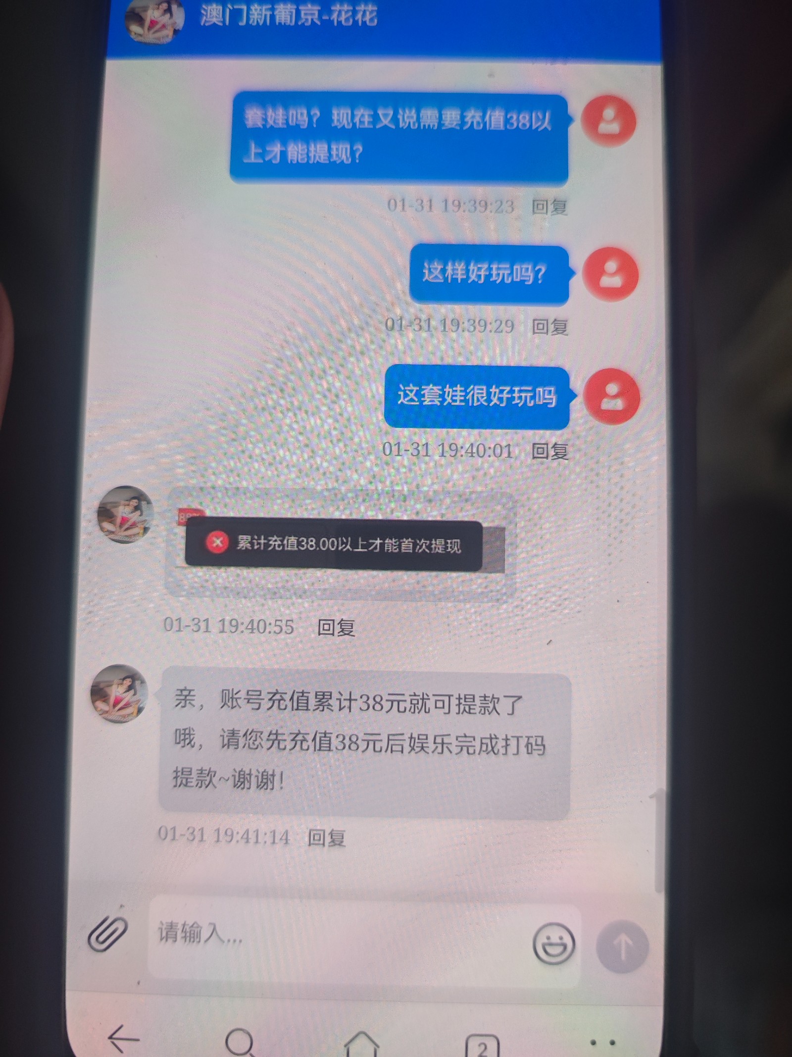 避雷,电话机器人打来的特邀新葡京38888特邀找客服送20。3水限制捕鱼棋牌电子,电子打完去提现会要求重新打棋牌捕鱼也是3水,打完提现又要你首充38元以上再打码才能提现。这种情况就是套娃。!避雷各位老哥,老哥要是有钱就试试看。我余额还在。。