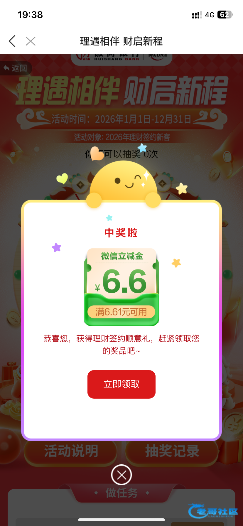 领完这个还有得领app点我我的权益里面活动中心理财相伴完成签约还可以抽一次奖,最低6块6微信立减金最高88,撸到的反馈一下,谢谢。