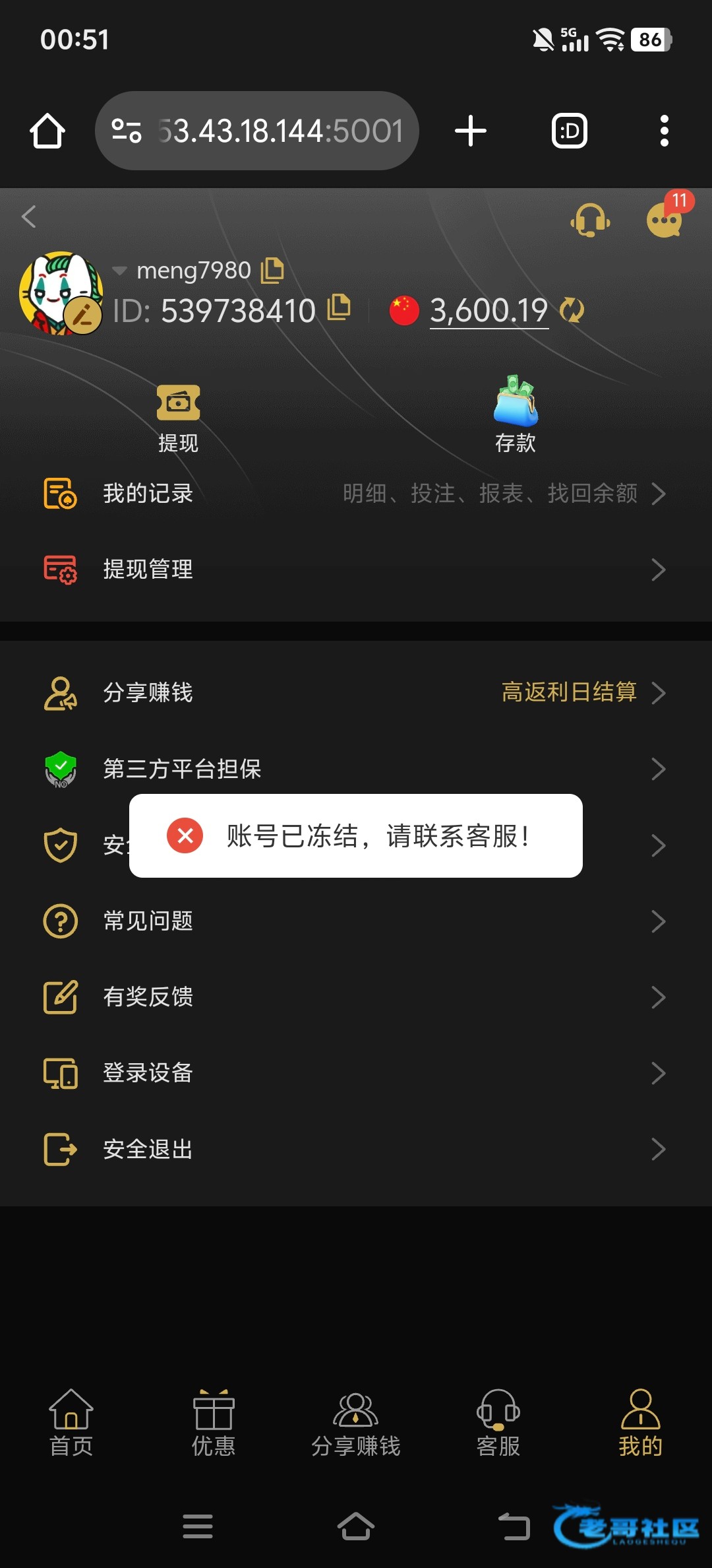 参加回归1000+888提3600直接冻结,准备v4玩了快一年了,也早就看到很多老哥曝光过,但是我参加了好几次存送提几千都没问题所以觉得不会黑到我,本金一千不退 老玩家也黑避雷吧