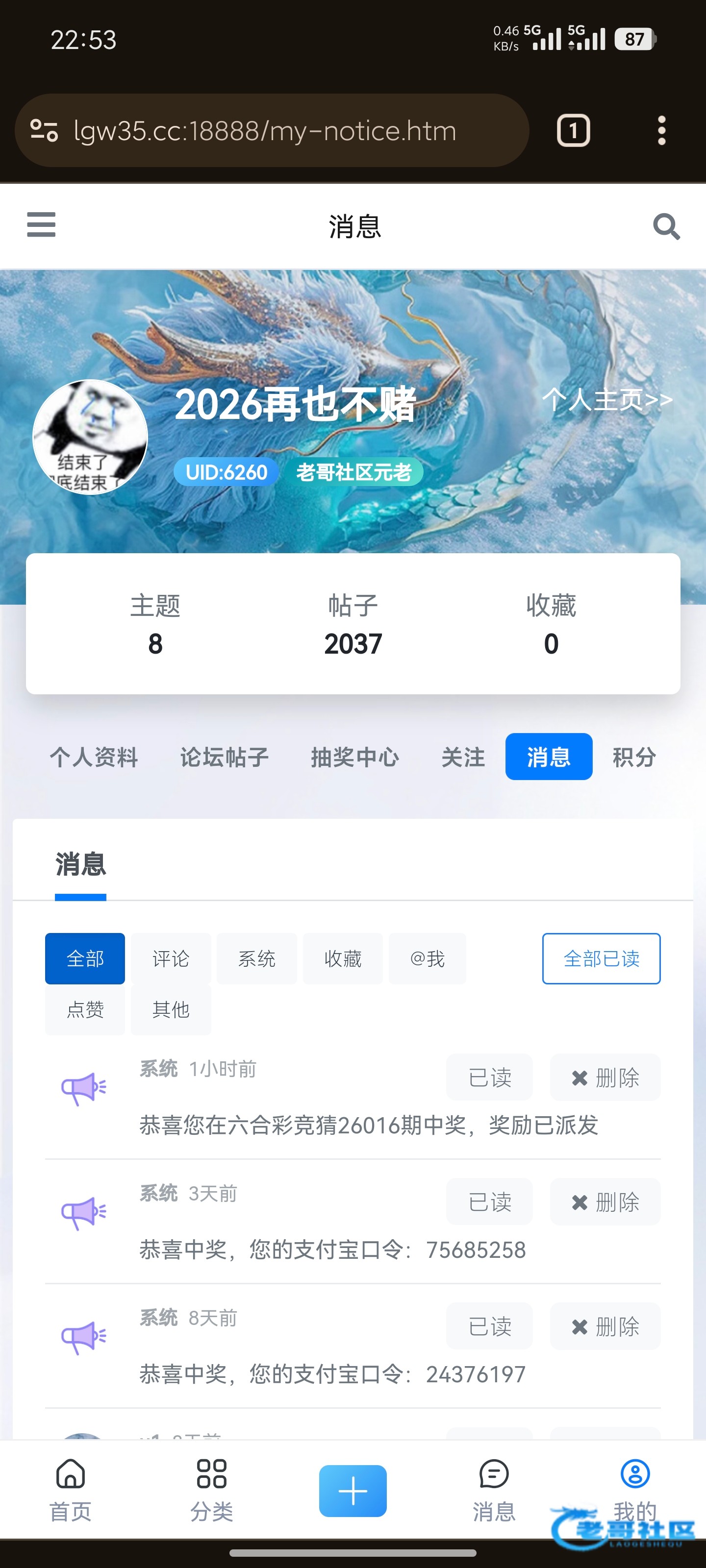 感谢老哥 第一次中六合彩
