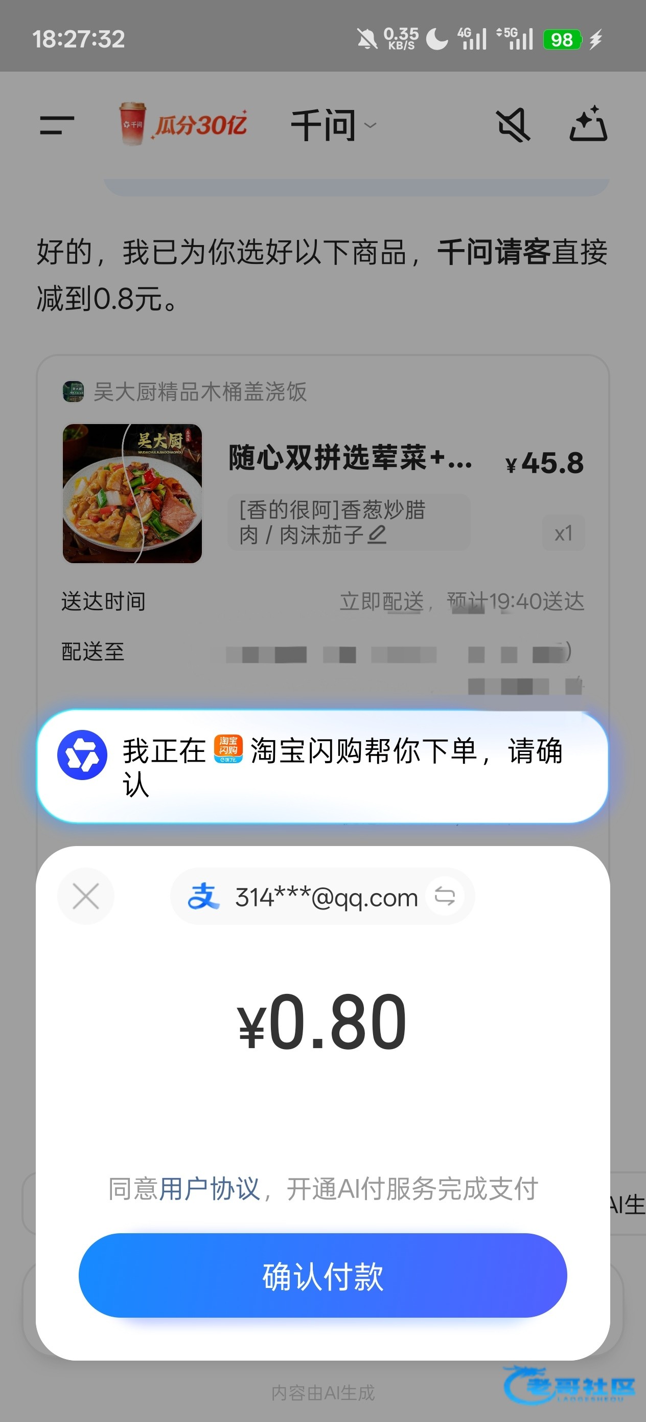 打开定位,不要通过活动页点去下单或者直接发【帮我点奶茶】,而是发【帮我点外卖】,如果一直只提示服务器卡就过15-30分钟再来发。如果有提示人多错峰,运力紧张,这个时候是可以点的,反复开关手机gps定位反复发【帮我点外卖】,就可以卡出点外卖界面了。只要卡出这个界面就一定可以下单成功,除了奶茶千问不会帮你弄成0.01的,自己点进店选购点25上下的就可以了,同理反复下单多点几次就能成功另外有两个小技巧,一个是挑人少的时候,比如早上凌晨,晚上深夜给千问发【帮我点外卖】提前呼出点外卖界面,等你饭点要吃的时候可以直接通过外卖界面点单。第二个是有的挂壁老哥比如我用不了支付宝,而千问是默认绑定支付宝支付的,没关系,你千问提交订单成功后可以在淘宝 待支付 订单里用微信支付。最后希望大家都能得吃。