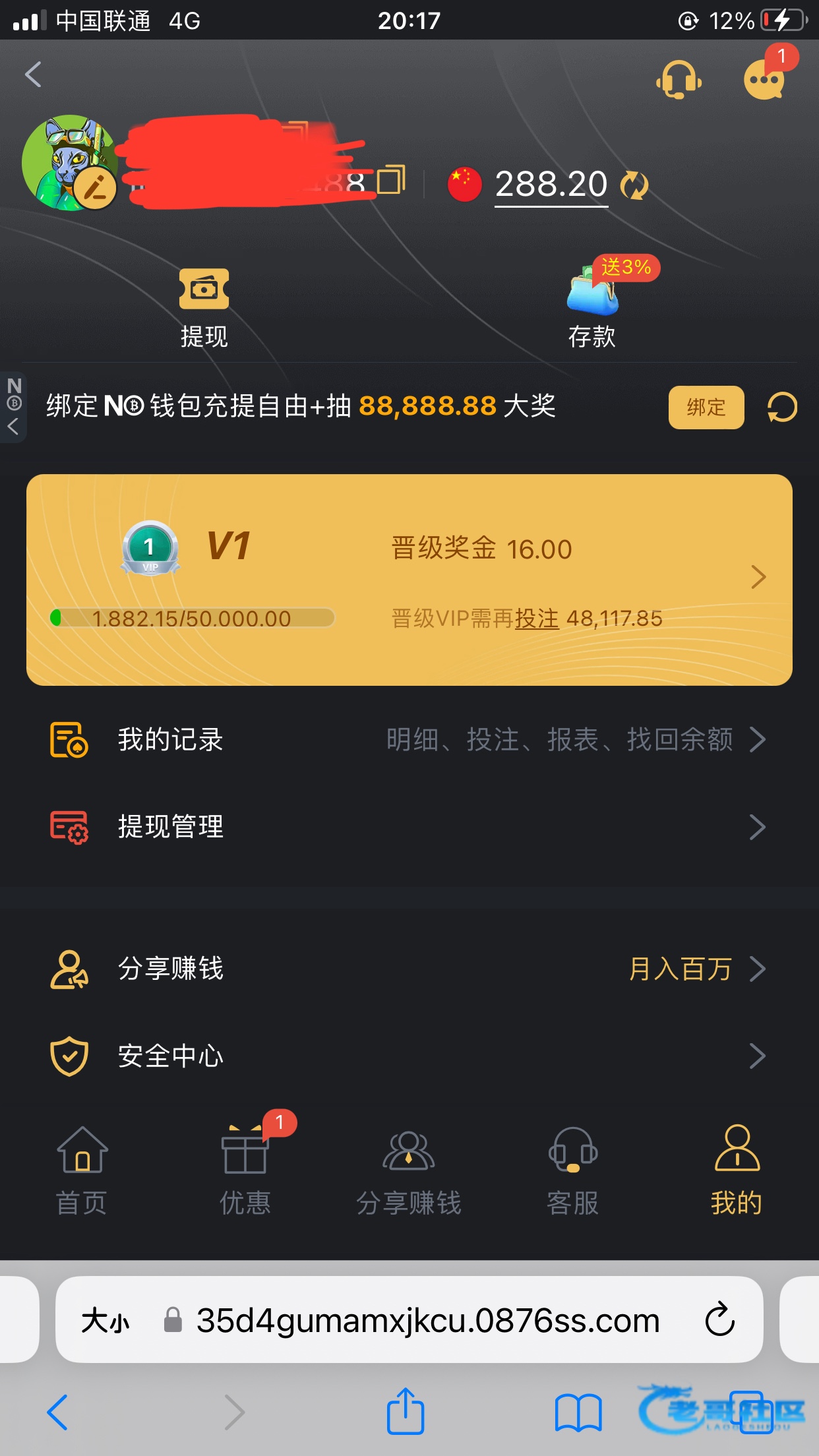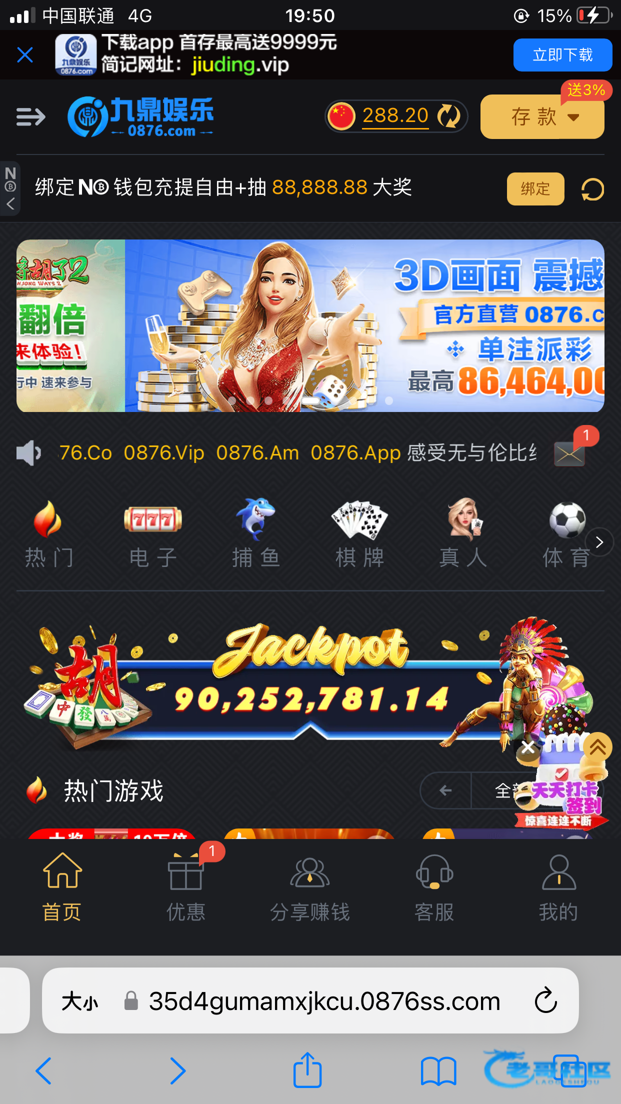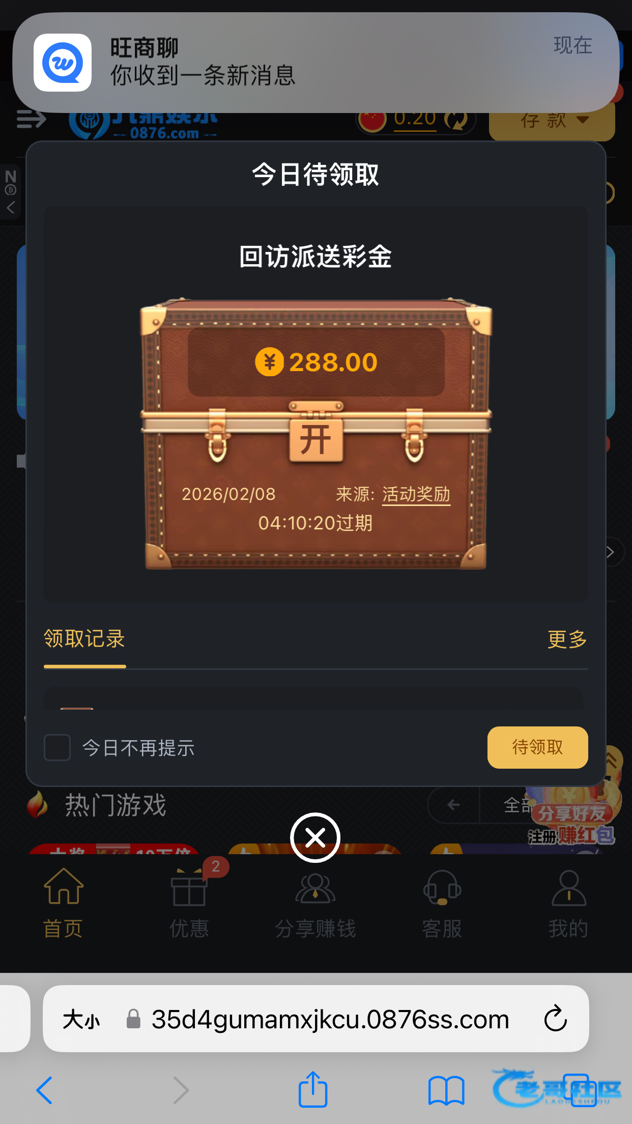 链接0876.com 刚刚接到电话送了288 老哥们有账号的登录看看
