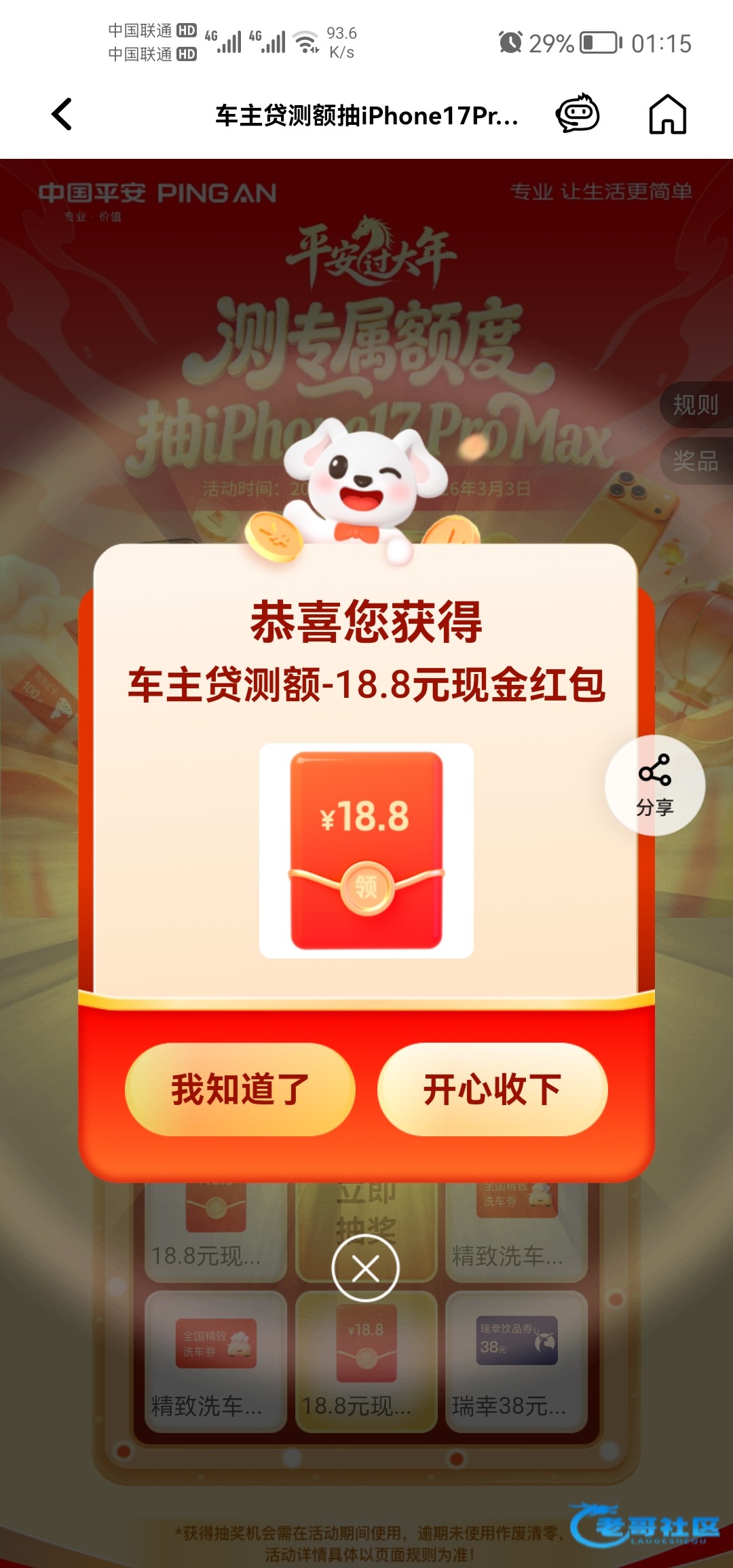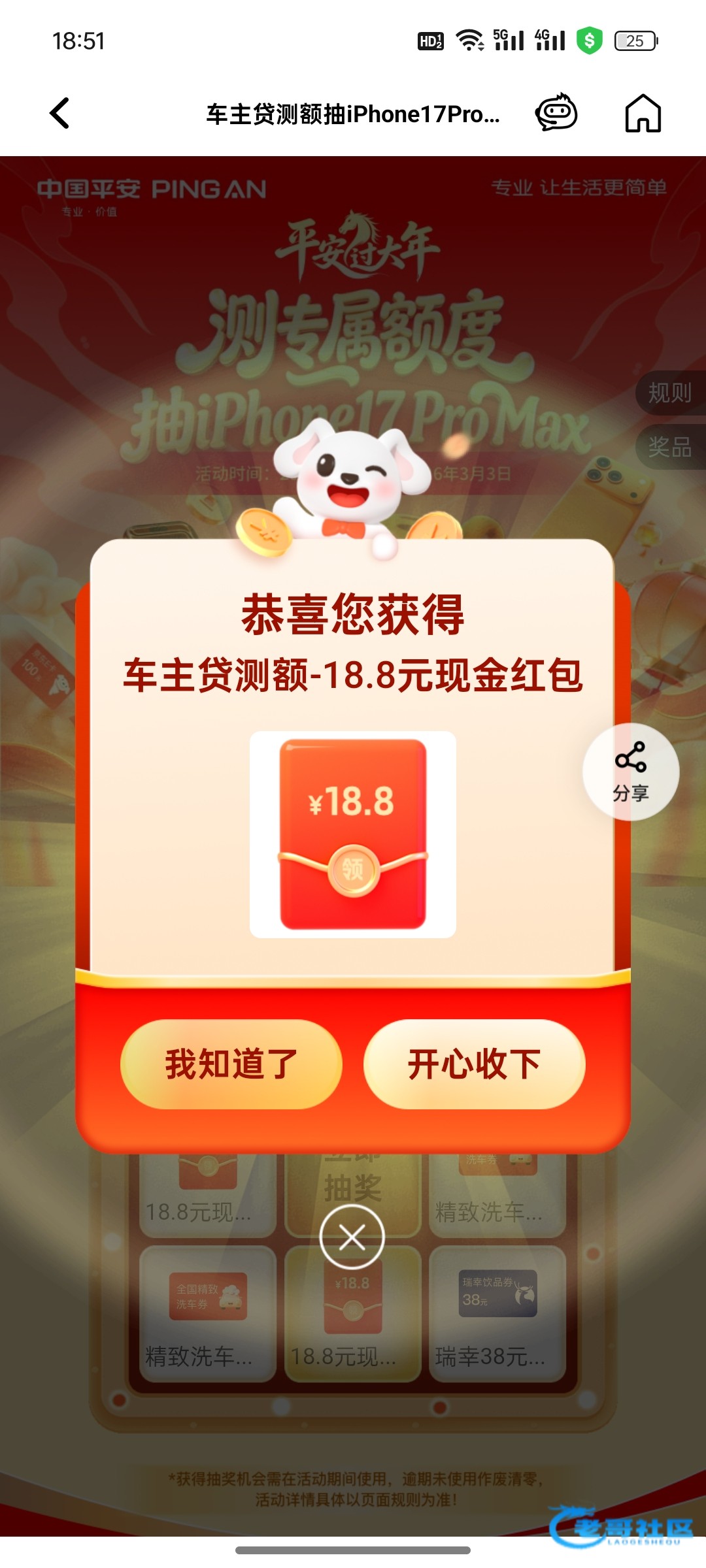 下载平安口袋银行,首页活动入口进入,找车主贷抽奖,车牌号随便瞎编一个,失败就可以,不用测额成功