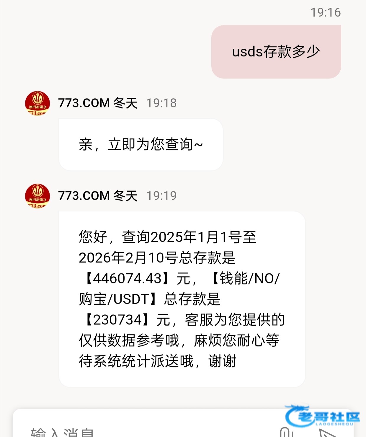 好,查看您在2025年1月01日至2026年2月10日总存款金额为【7659185】,其中钱包存款金额为【6579432】呢,您可以核对下哦,但是由于数据较多客服提供您的仅供您参考哦,具体要以派送的金额为准呢