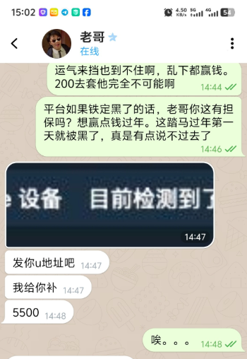 200上5500被黑5500,老哥担保靠谱已全赔付,台子名字就不说了,老哥还在处理,给兄弟们团一波