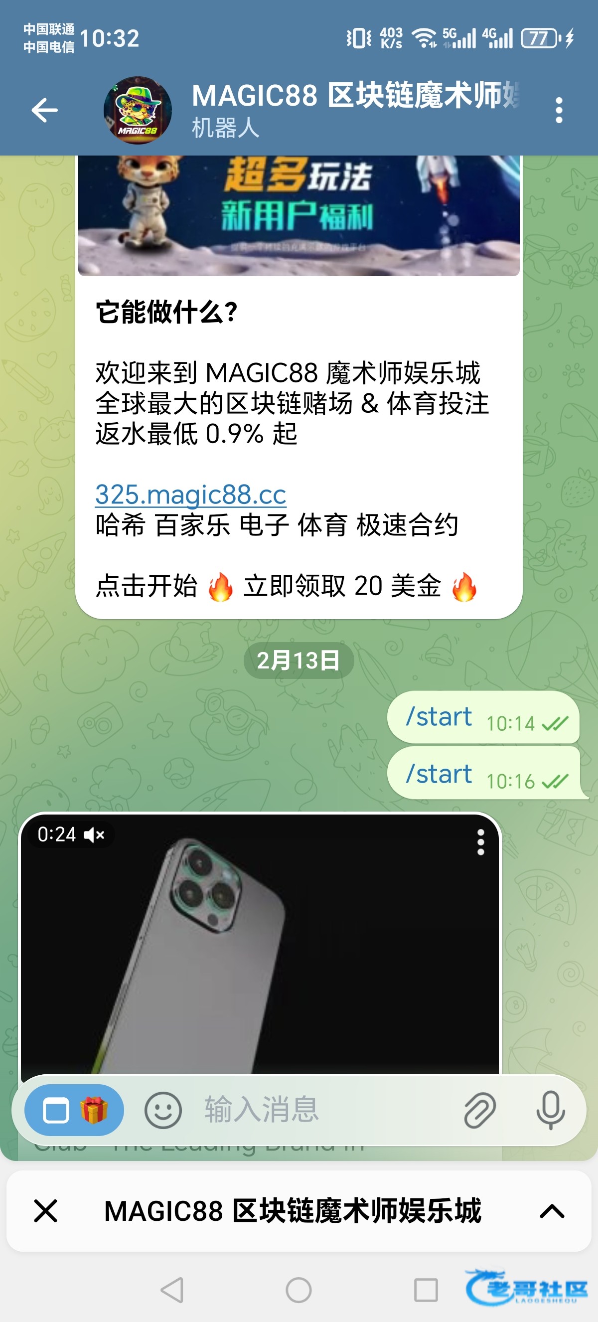 添加机器人,点开始,/start