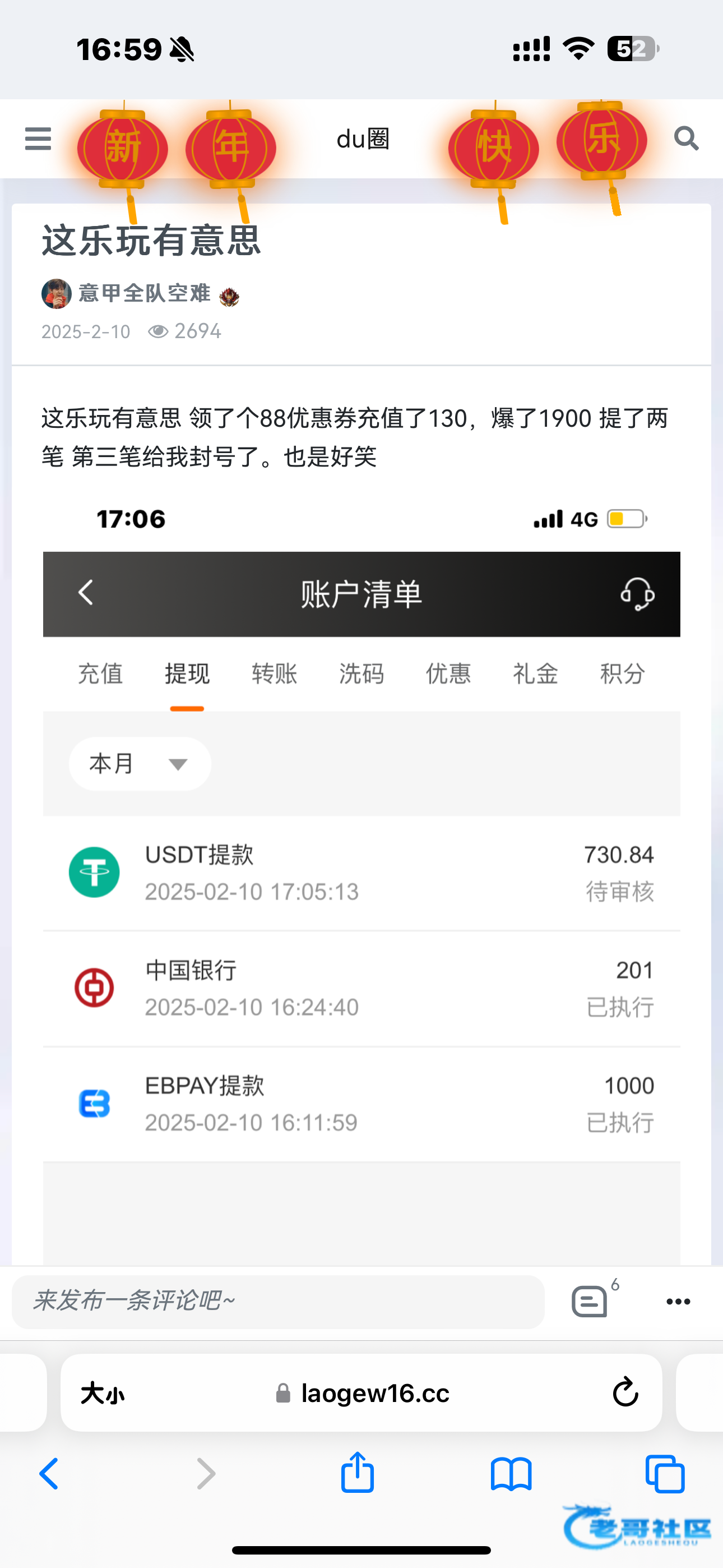 去年过年乐玩也是小吃结果提第三笔的时候封号了笑死我了每年