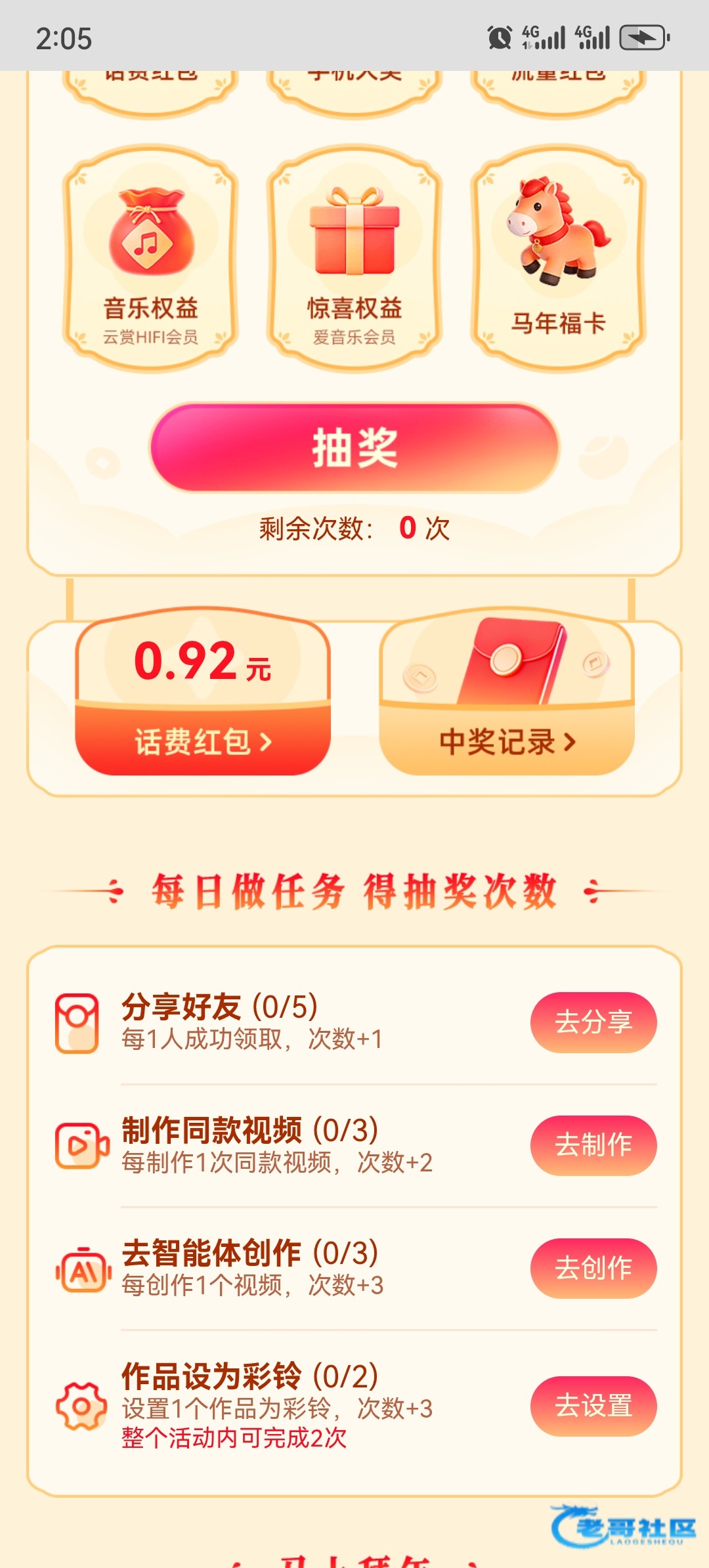 进去后免费抽5次,任务点一下就有20次,一天抽10多元话费链接https://ai.imusic.cn/h5v/fusion/2026-new-year?rpc
