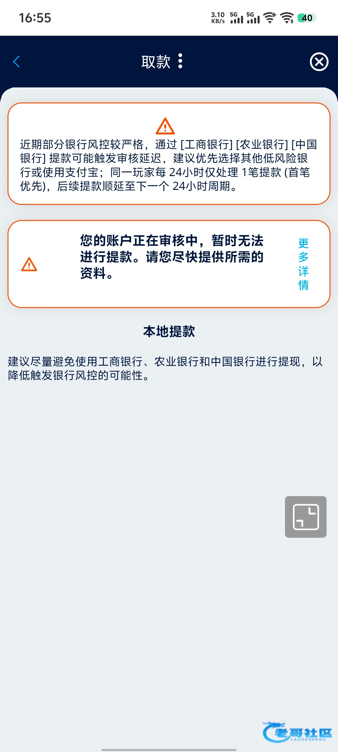 清风明月晓星尘 ▶ a498926 你没充值吗,我提了两百给我取消了,封优惠,取款,然后联系客服说充值解除限制打一倍流水在提款,一个多小时了,客服说在处理了需要较长时间,现在还在限制呢,我就等着解除然后打流水,看这样子今天是解除不了了 1月前