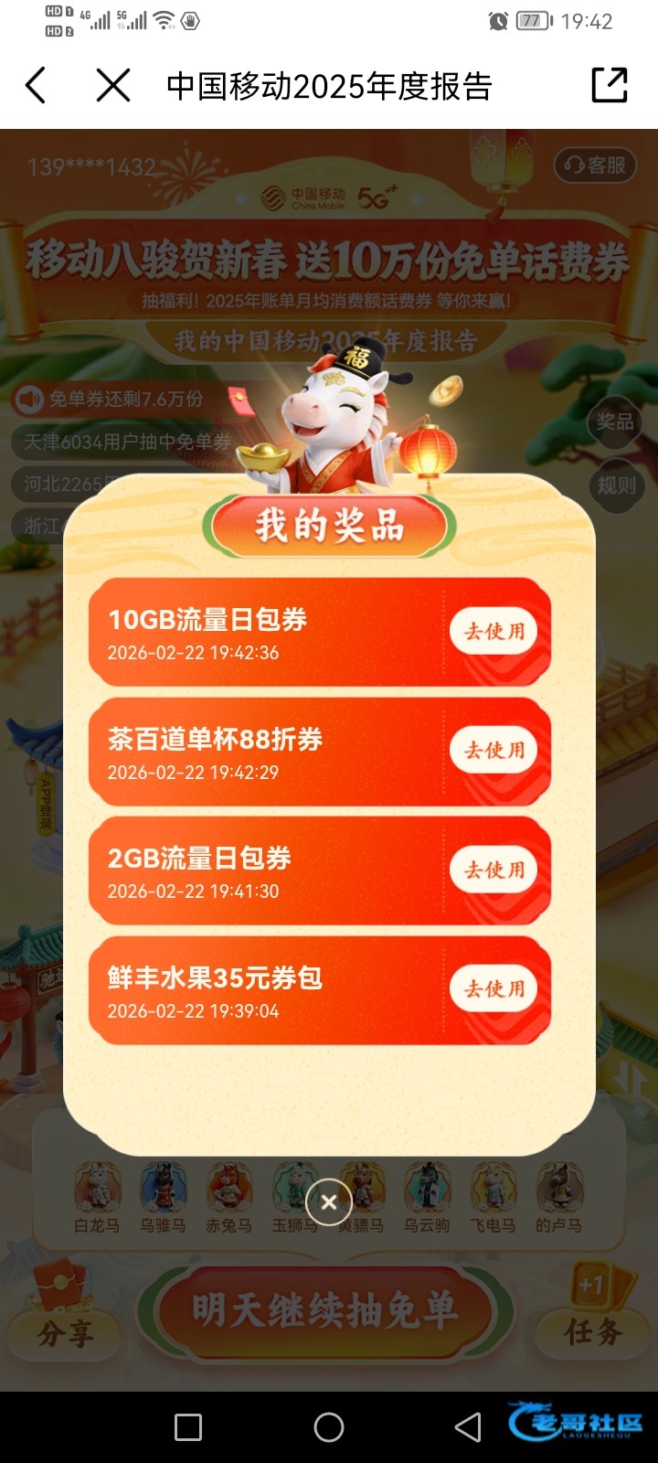 中国移动搜:2025年度报告每天抽三次,有机会抽几十话费,或者流量包。