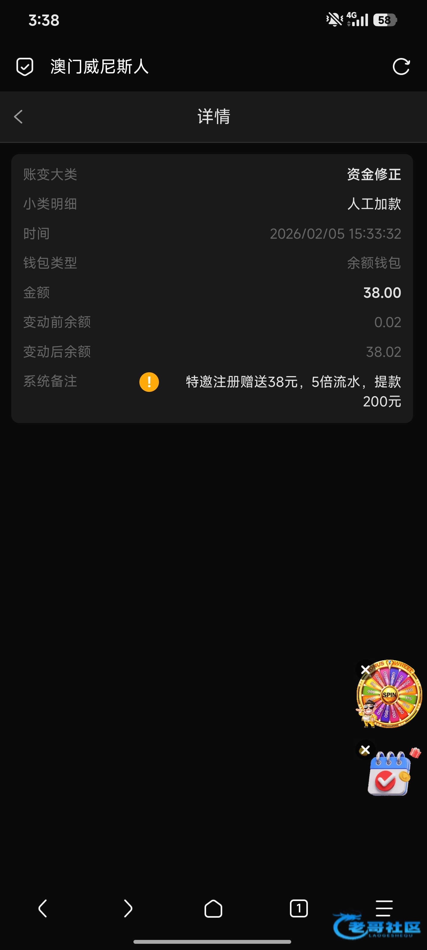 这个台子以前每周都送,有时候送38有时候送58,自从手机被反诈强制停机,我改了手机之后就没送过了。两年前这个台子叫银河娱乐城,我单次提上万都给出。改版之后就换了这个名字,出上千都黑,我都只敢500左右就提款,虽然我是vip6