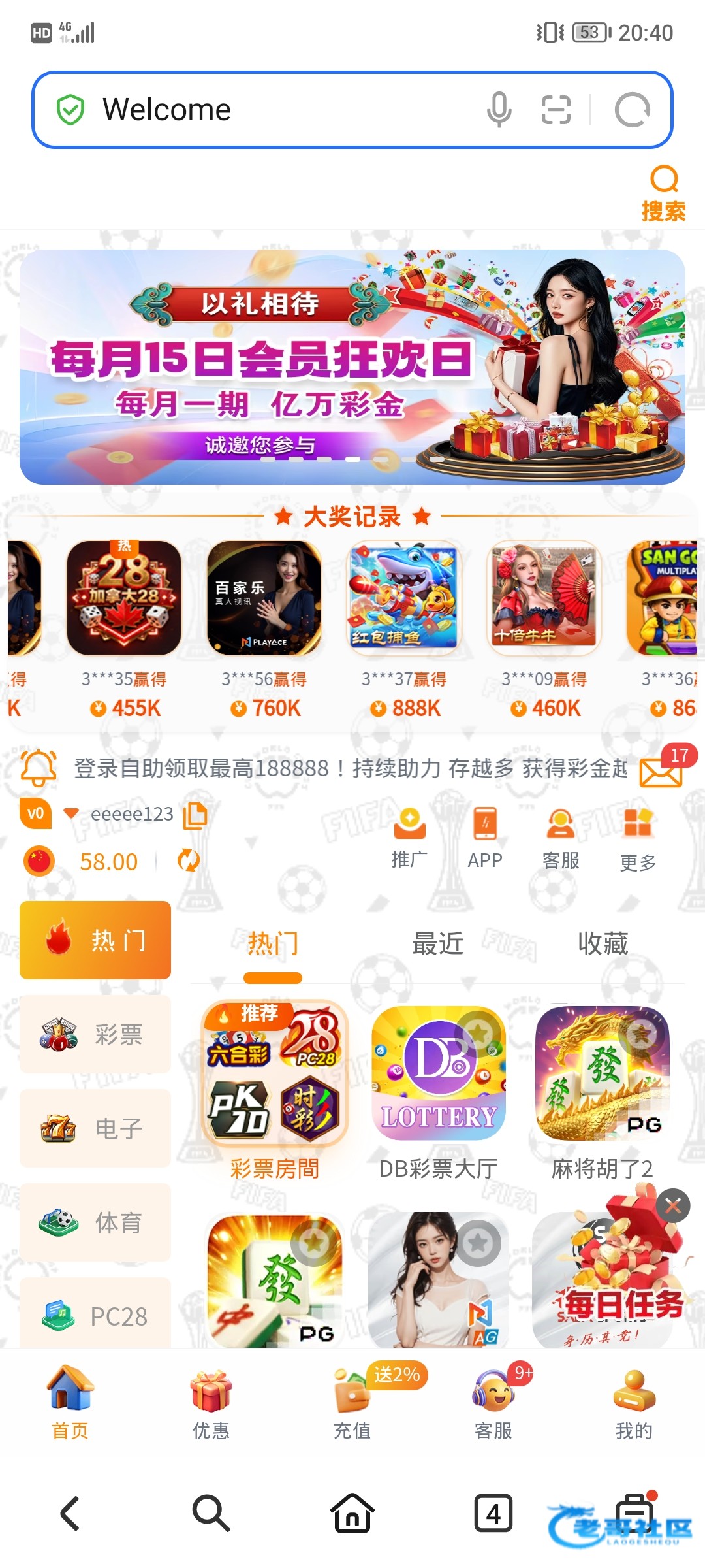 送58块我接到电话去的,你们有时间有兴趣可以去碰一下,或者去漏接电话的,可以去看一下,去打开优惠那里有个下载信聊,找客服经理领取电话,彩金就可以了,我领了,提了100块,玩女磨了一个小时没有什么水,链接5092.com