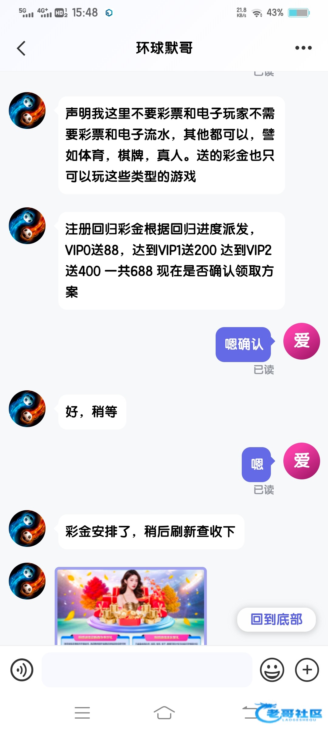 去年这个叼平台送了我288,也是添加的旺旺送的,也是提供了我其他平台最近流水。给送了。我打到2000,直接给我冻结账户,找旺旺沙币客服直接给我拉黑,没格局的台子