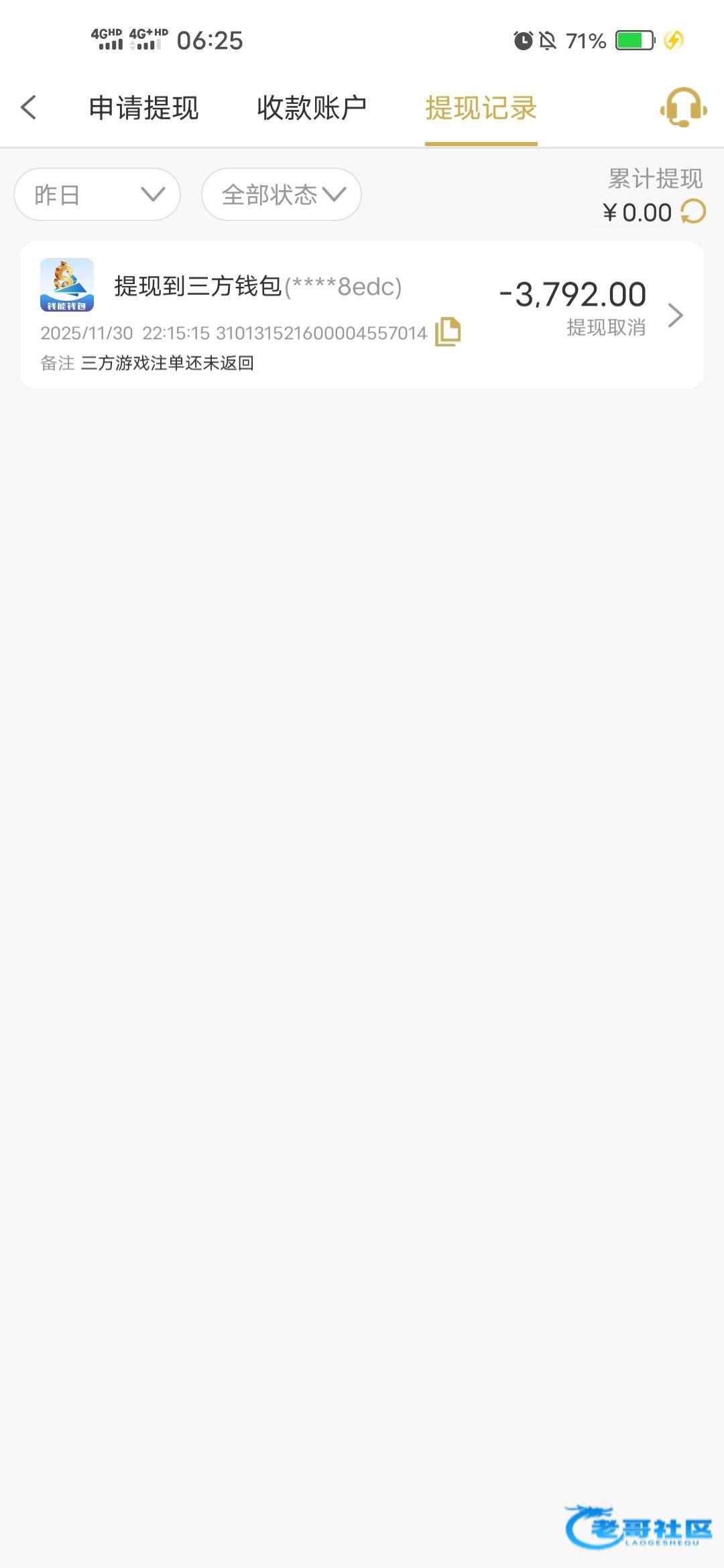 1348死妈黑台 充2500多 玩彩票赢到3800不给提 一问就一直第三方注单未返回 兄弟们还在玩的避雷了 连他妈赢个1000来块都黑的逼东西 充了好几万没想到赢个1000都出不来