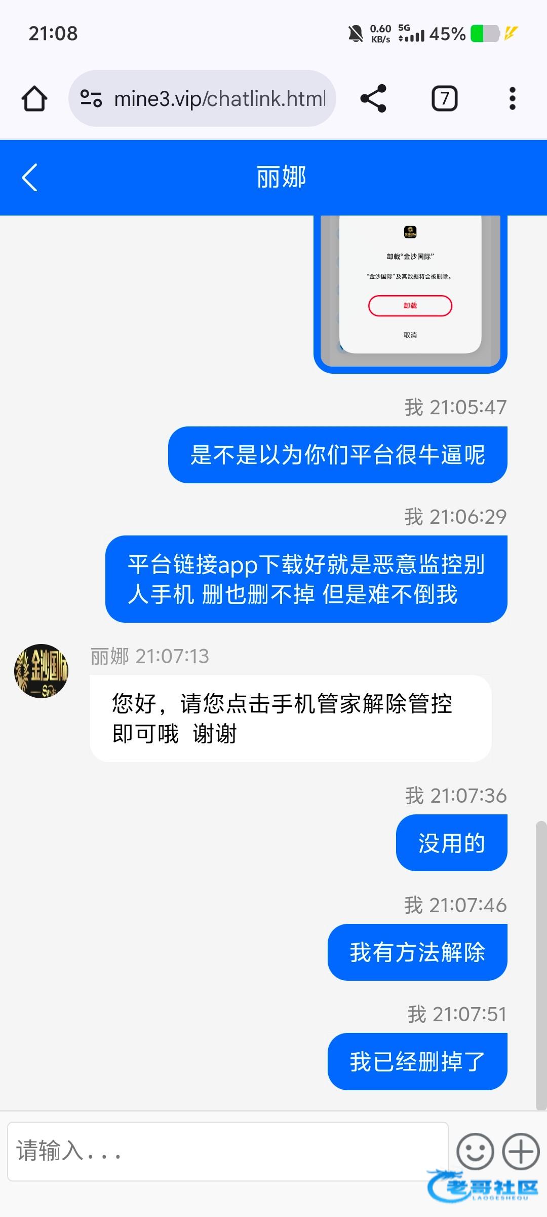 群里有个兄弟发了我一个平台链接 领取彩金必须下载他们平台app 但是那个app下载安装好必须授权 重点来了 授权好以后 他那边好像可以控制你的手机 不管你进什么软件都是秒退 授权也去不掉 但是我给他破解了 已经成功删除 并且骂了一顿那个垃圾平台客服 兄弟们小心一点不要乱下载软件