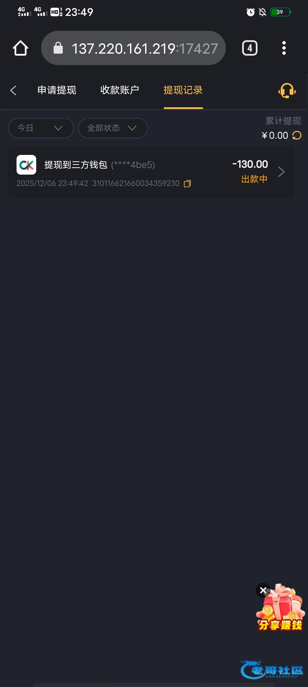5块钱打出来了,就看能不能到账了