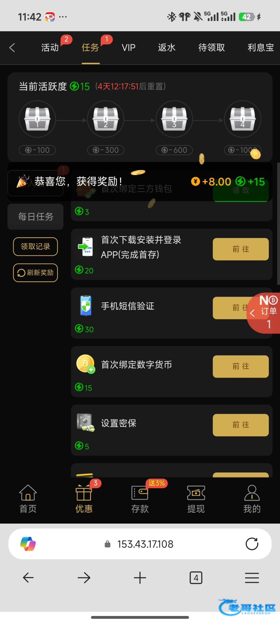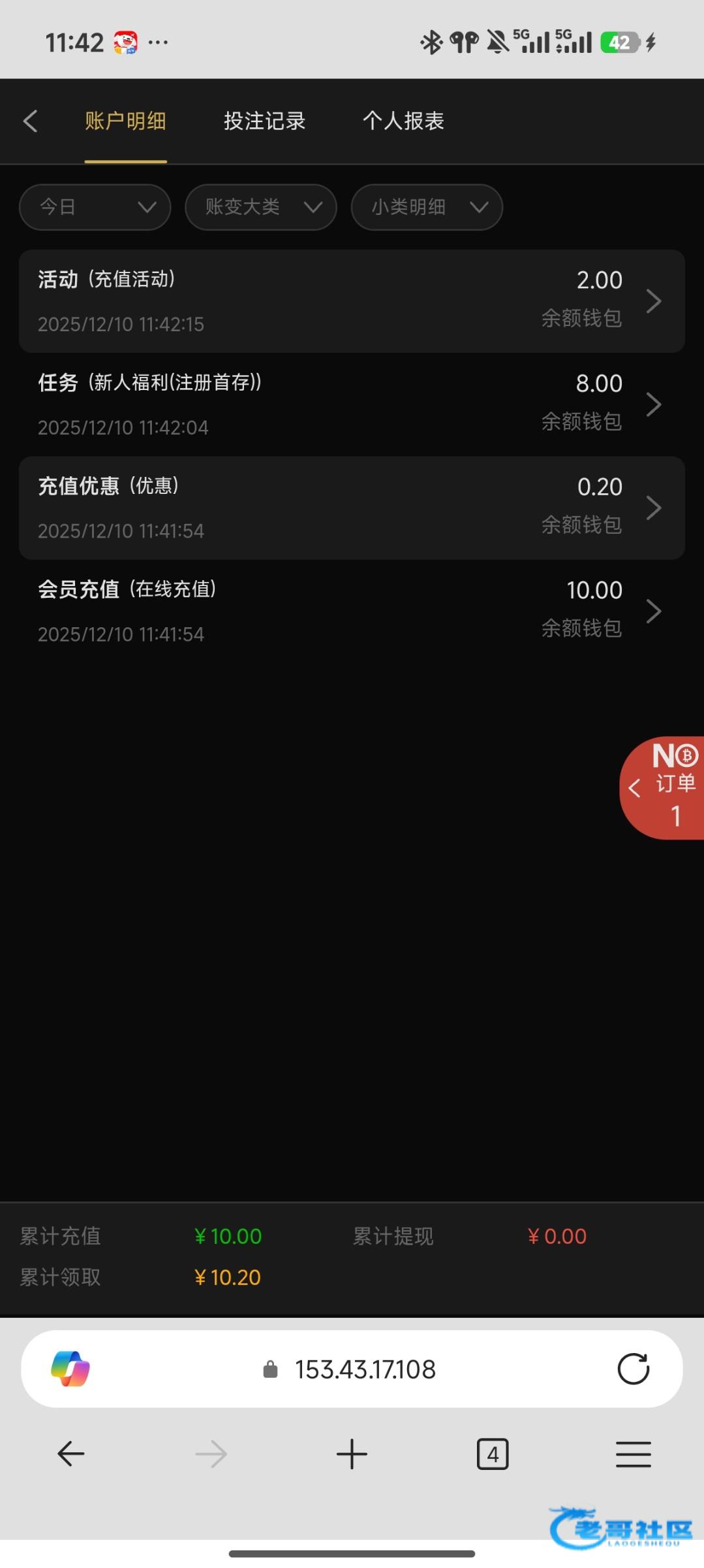 链接1158.com 存10以后可以领新人首存2,再去任务领首存8,一共10,以小博大项目,出款自测