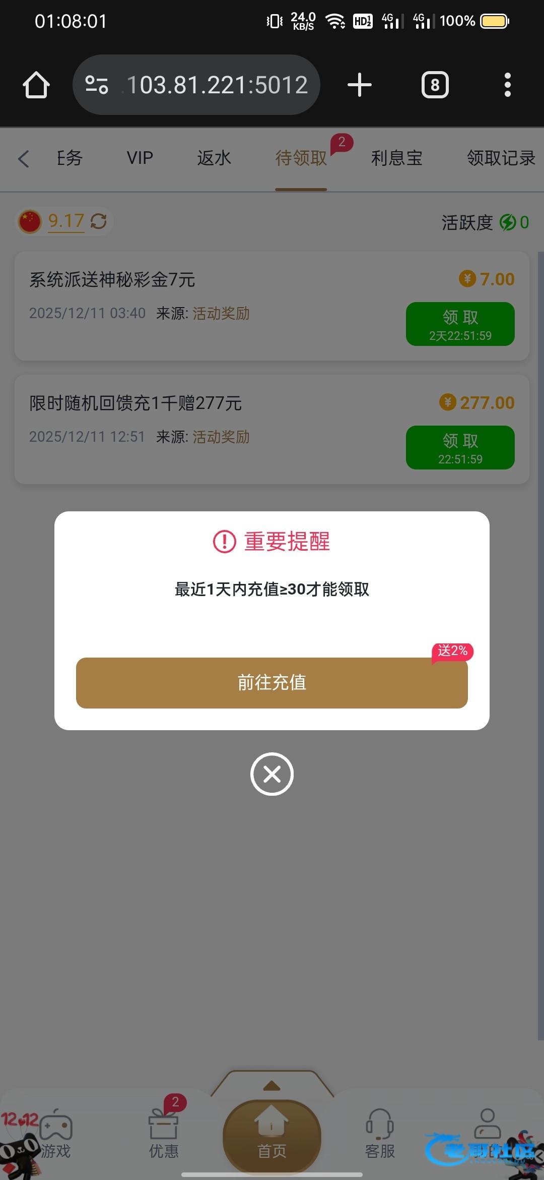 这台子的彩金好像都是要当天充值才能领的
