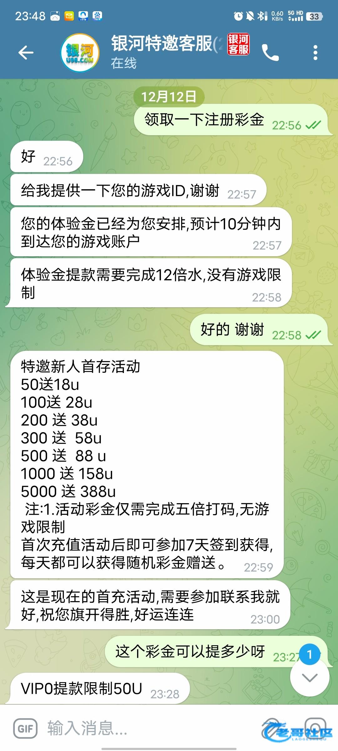 飞机加客服@YHKF_Fc 然后说注册彩金 注册之后发ID给她送18U 12倍水不限制游戏 最高只能提50U 客服说多赢也可以全部提但是要充值一笔 最好白嫖充不充自愿 我打出来了 怕黑输到50U提了几分钟到了网址 http://u907.vip。