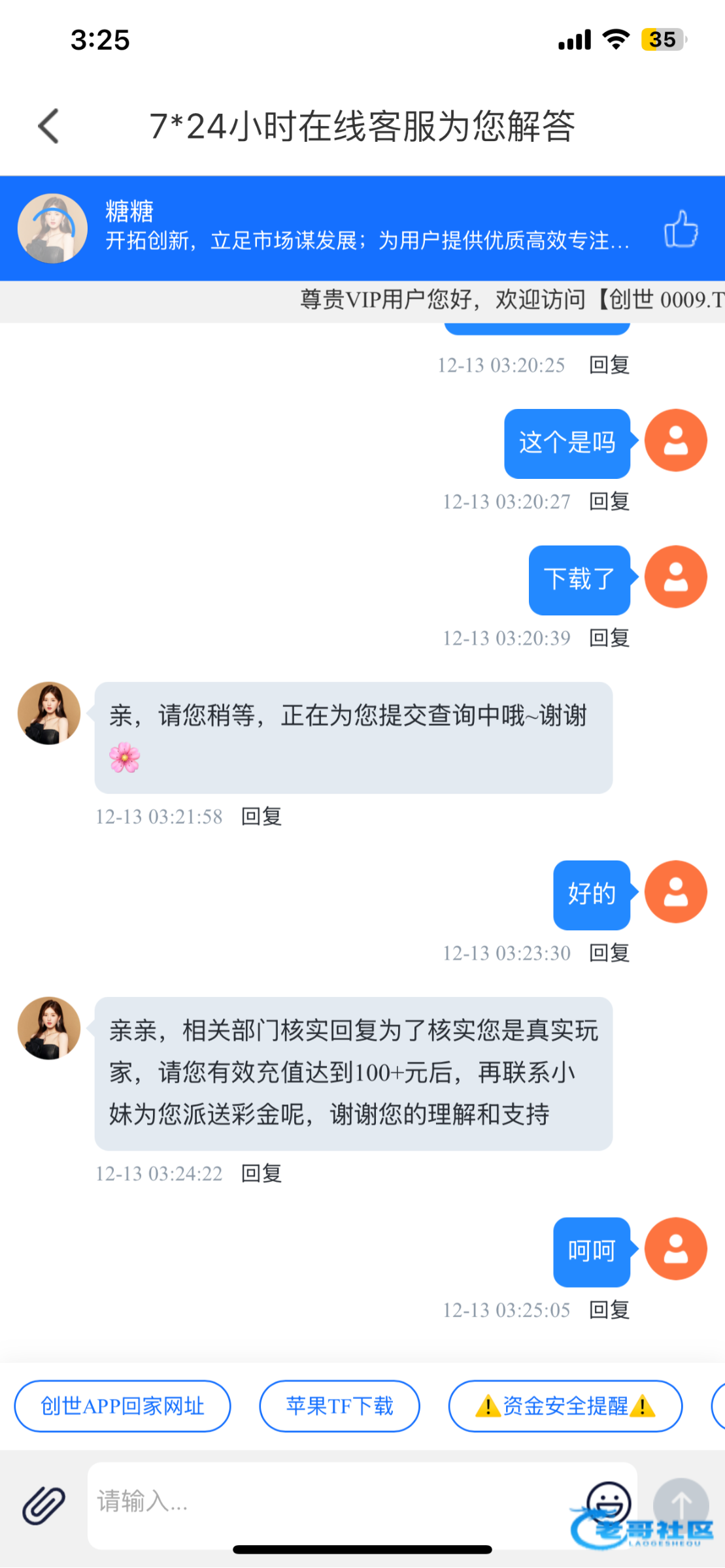 亲亲,相关部门核实回复为了核实您是真实玩家,请您有效充值达到100+元后,再联系小妹为您派送彩金呢,谢谢您的理解和支持