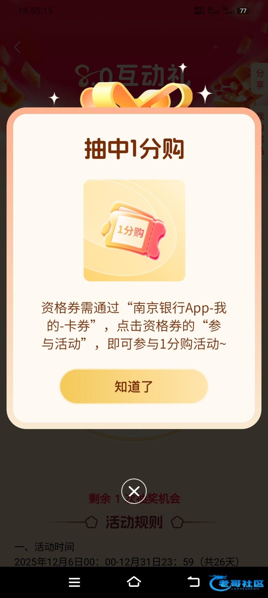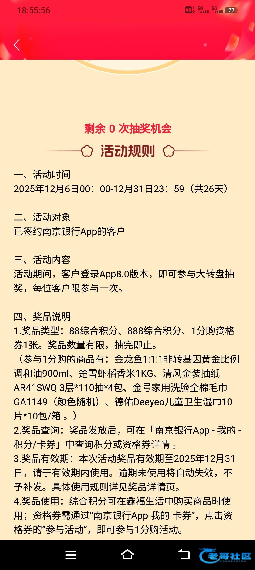 下载南京银行app,更新至最新版本。首页8.0互动礼点进去抽奖。