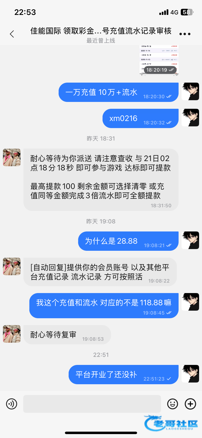 提供的流水充值截图对应的118 结果只送了28 本来寻思21号开业不急 没催他给我补