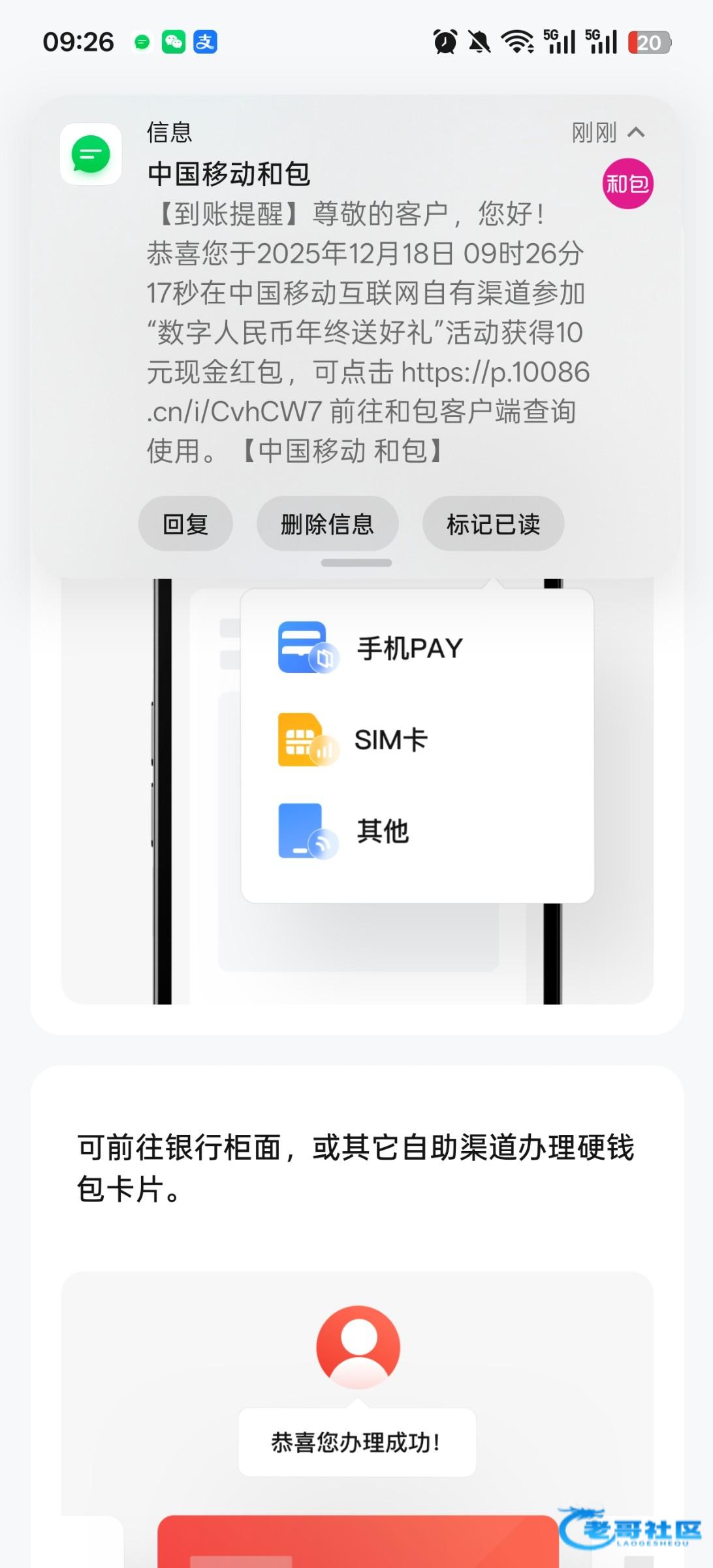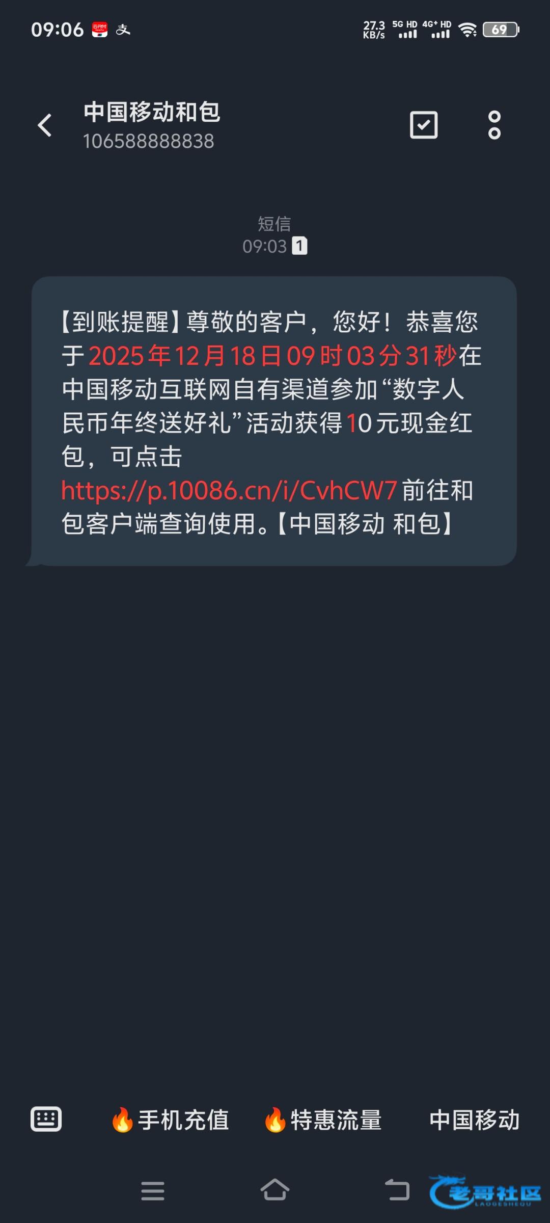 移动app充值话费1元,充值的时候选择数币支付,支付完稍等一会短信就来了,现在必得10块,下载和包登录提现即可,充值自己的手机号,就算到时候红包没了也不会亏