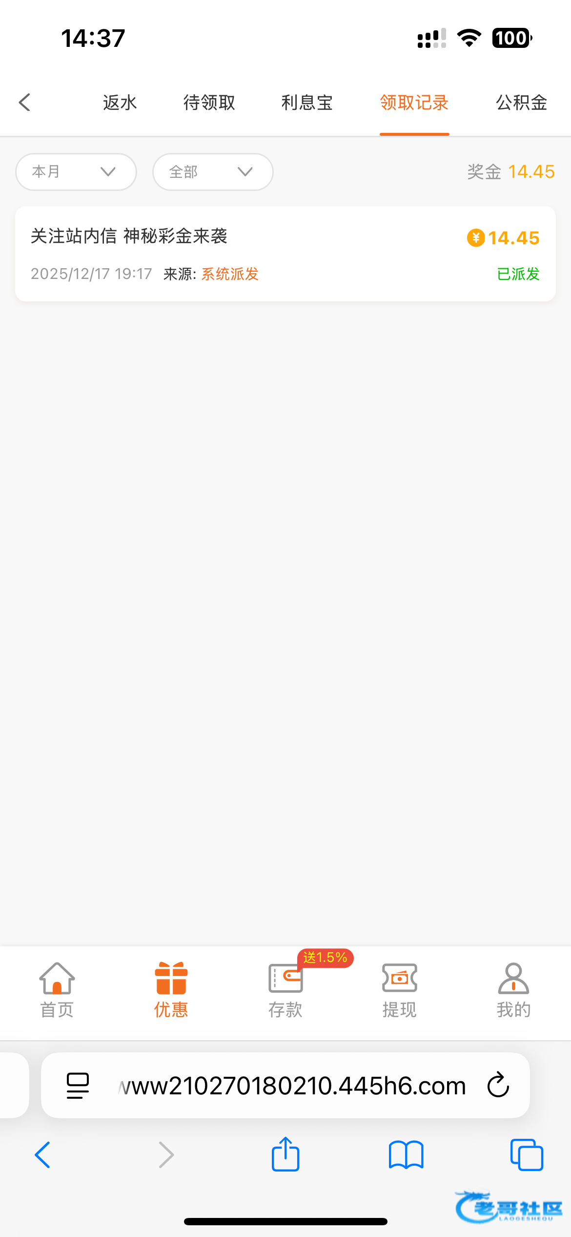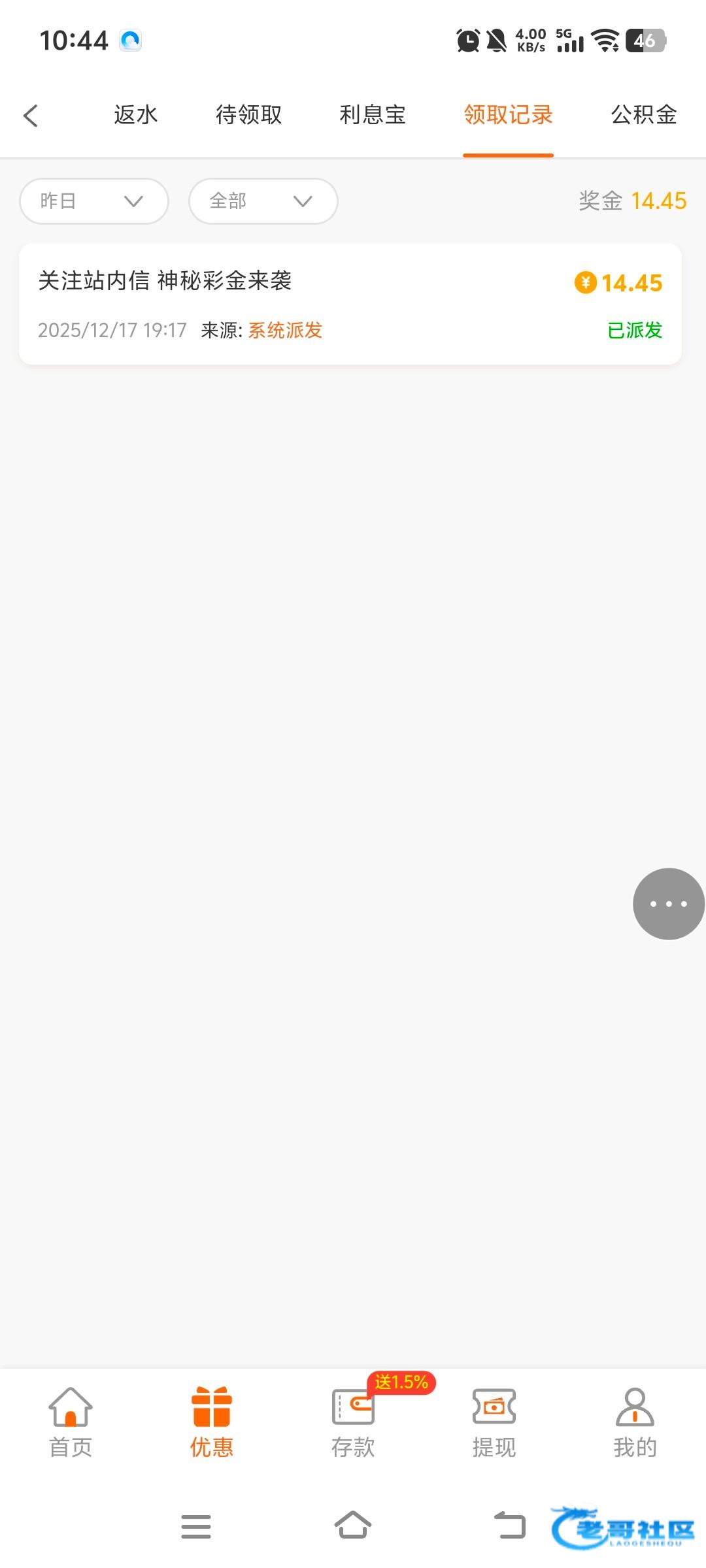 我看记录是昨天派发,今天才上号领取的,以前充过一百几十。链接445.com