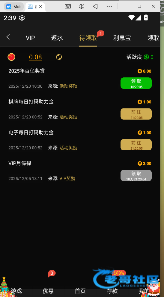 262.com,领过双12号彩金充值过的应该都有,没充值的无视,我上次充值是12号充值的,领取没要求,我打出来了,10起提