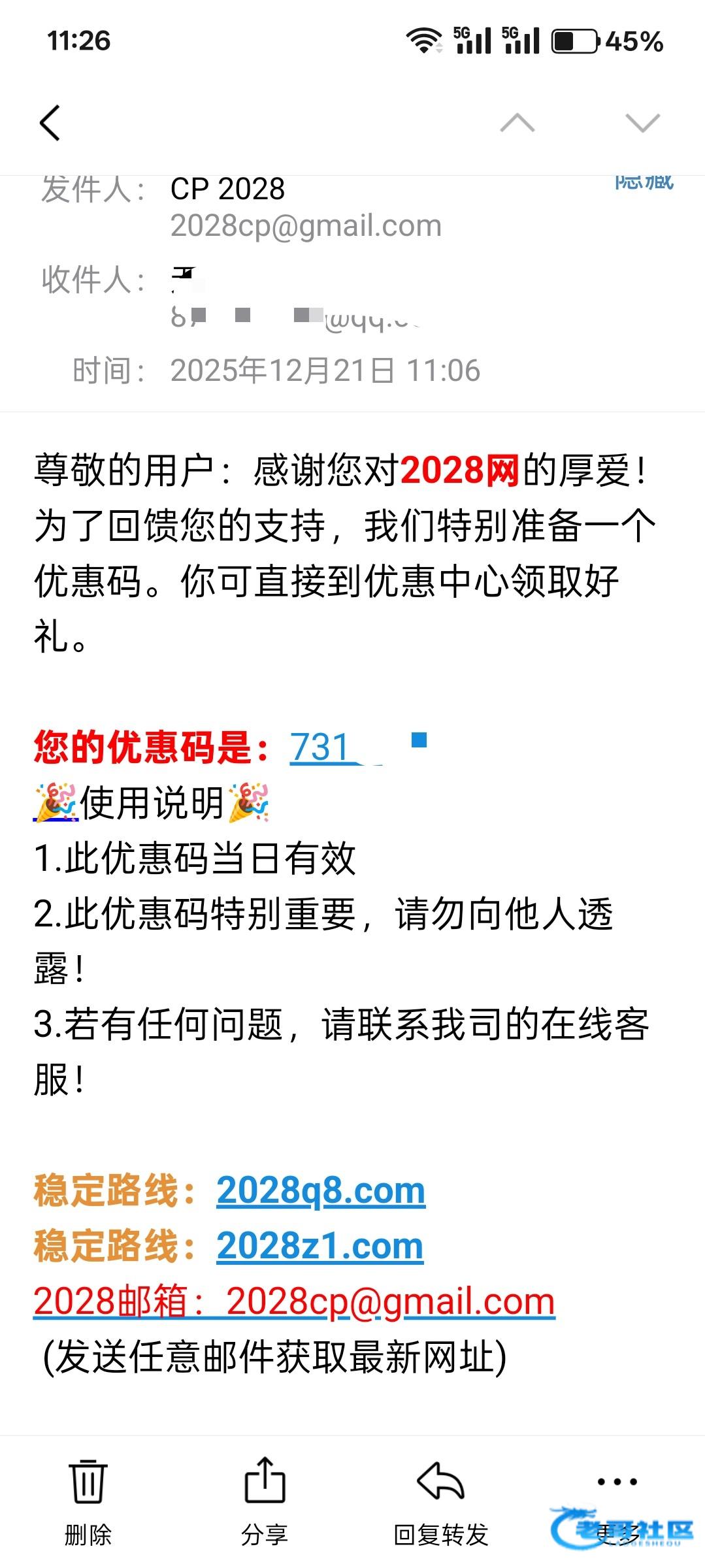 优惠码你打码你妈呢,你还发出来干嘛,老哥们要是邮箱收到了自己不会看吗。你还打码。你真是个畜生啊