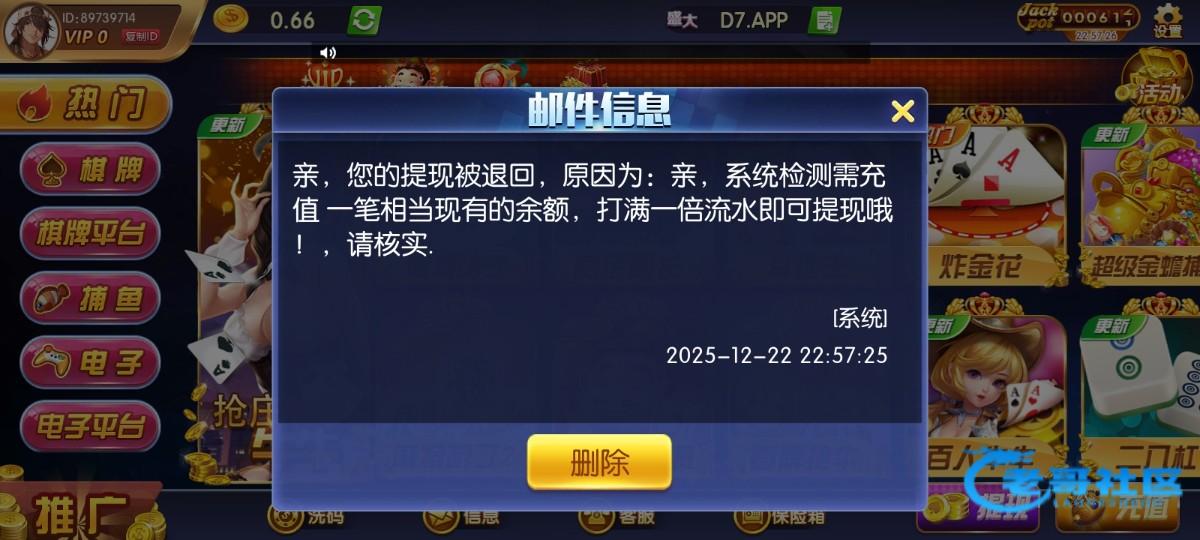 兄弟们曝光一个平台,盛大棋牌D7.app它里面有那个8:00斗地主,但是你斗出来的话,你要充值一杯水,不给我提,建议玩老哥台