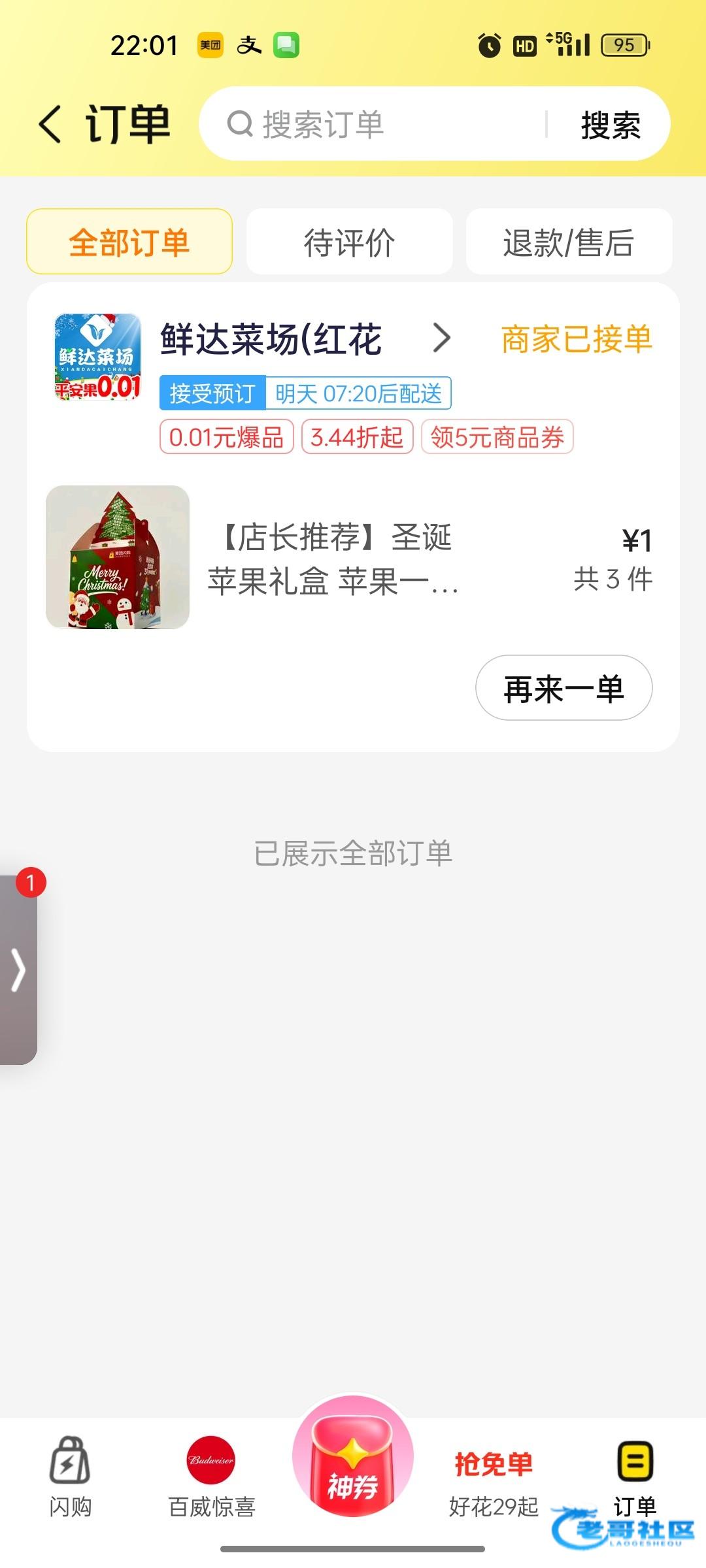 美团app里找到闪购去抽,抽不到可以多试几个号我一发就抽中了,可以白嫖三个苹果,祝各位老哥圣诞快乐