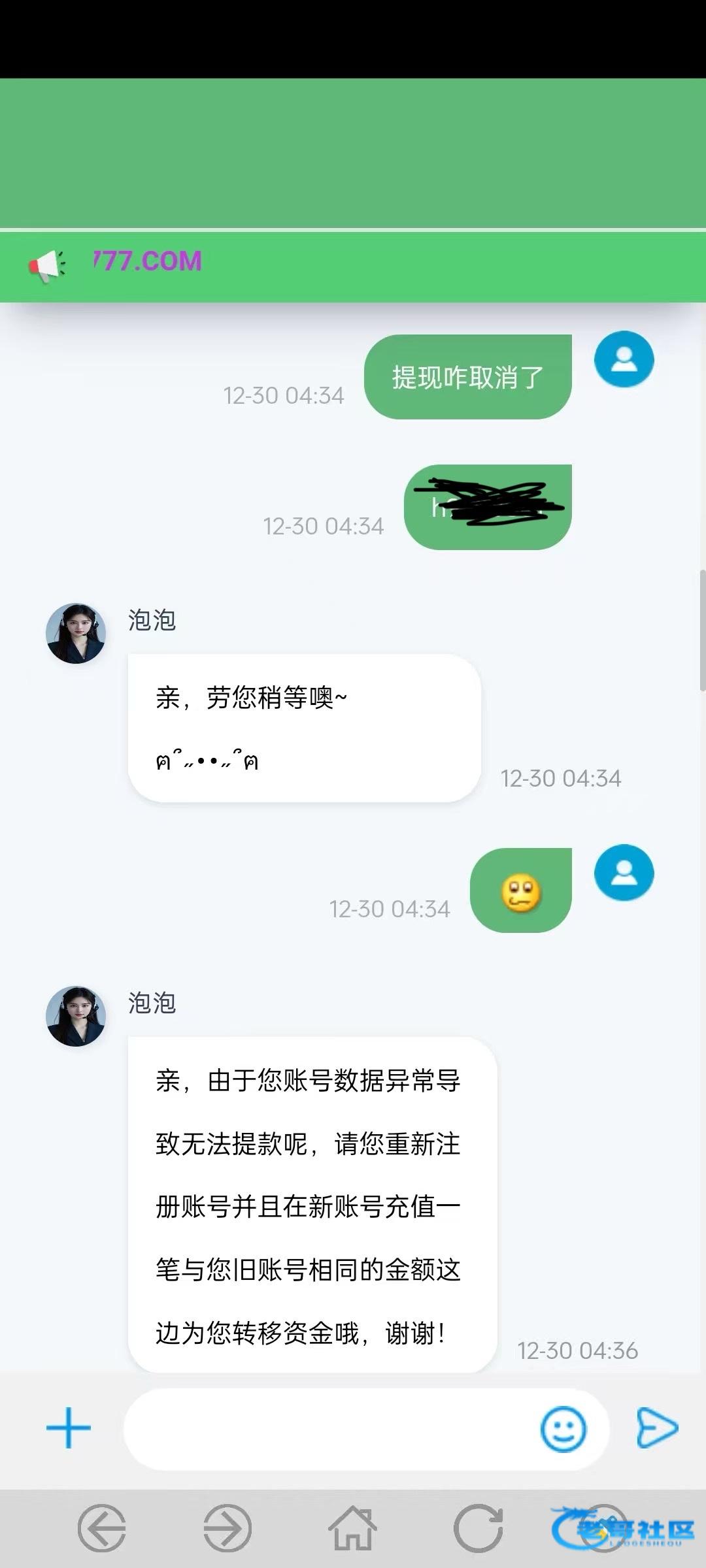 上个礼拜取款给我罚20倍流水,后面给我提了,昨天我充值打半天打得还剩一百多想着取款算了,等半天取款给我取消了让我找在线客服,找在线客服说我账号异常要我重新注册个账号充值同等金额。我想着才一百多也不至于黑,然后重新注册了个账号充值了同等金额,结果充值完跟我说只能返还充值的百分之十,然后我打完流水就提了也到账了。今天我又充值了200打到300提款,等了几分钟看见取消了就感觉不对劲,一去问又是注单延迟。