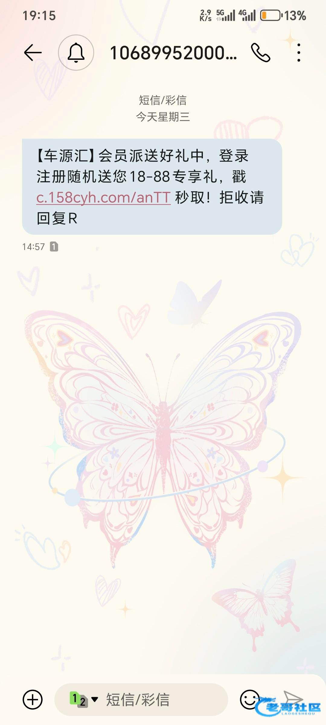 短信内容【车源汇】会员派送好礼中,登录注册随机送您18-88专享礼,戳 c.158cyh.com/anTT 秒取!拒收请回复R