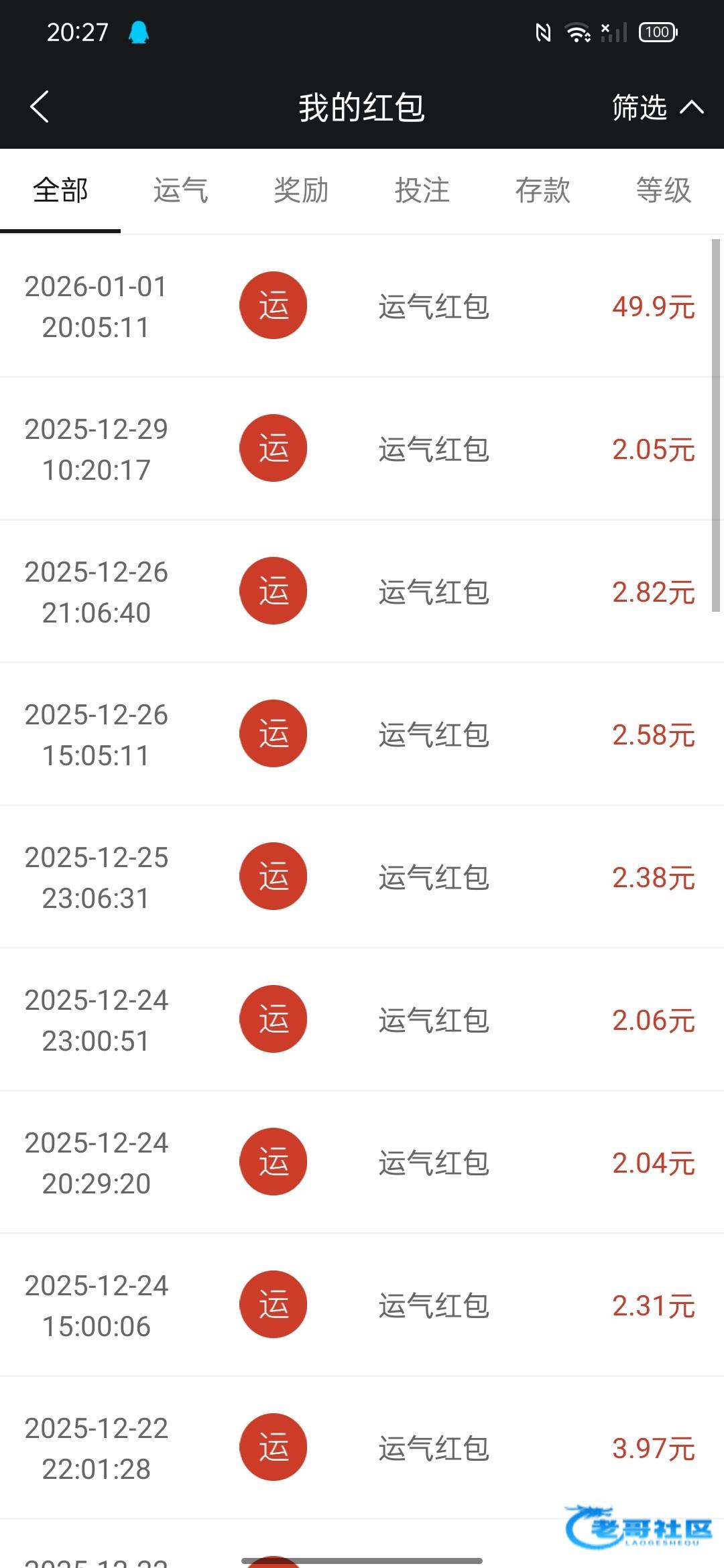 老哥稳米斯特 ▶ 坤坤46 我是v7,10月份一个月打码100万,然后10月红包还是2块,11月开始每个包都是30左右了然后没钱了12月开始红包都是2块钱没有过加赠,然后这个元旦应该是运气红包吧我平常现在都是2块 2月前