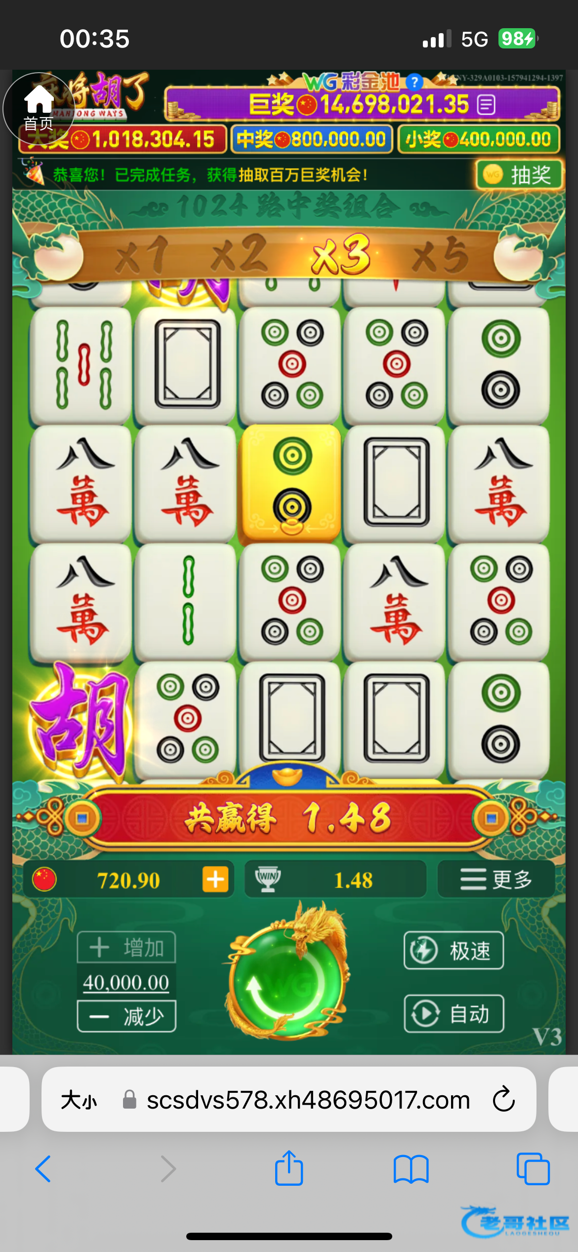 我发现一个很无语的事情,就是小奖金额=投注的10倍。但是你完成任务的时候还可以调你的注码。也就是说。你可以自由选择奖金,最极端的看我下面的图片。不会很明显命中率他会调的非常低吧。我2毛1拉,最后调成1块,也中过一次10元小奖.......所以如果挂壁了,想要很多钱。wg恰好完成任务到最后可以调大一些试试,万一真给呢?