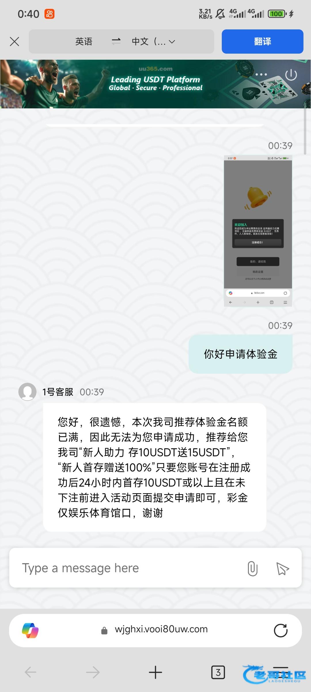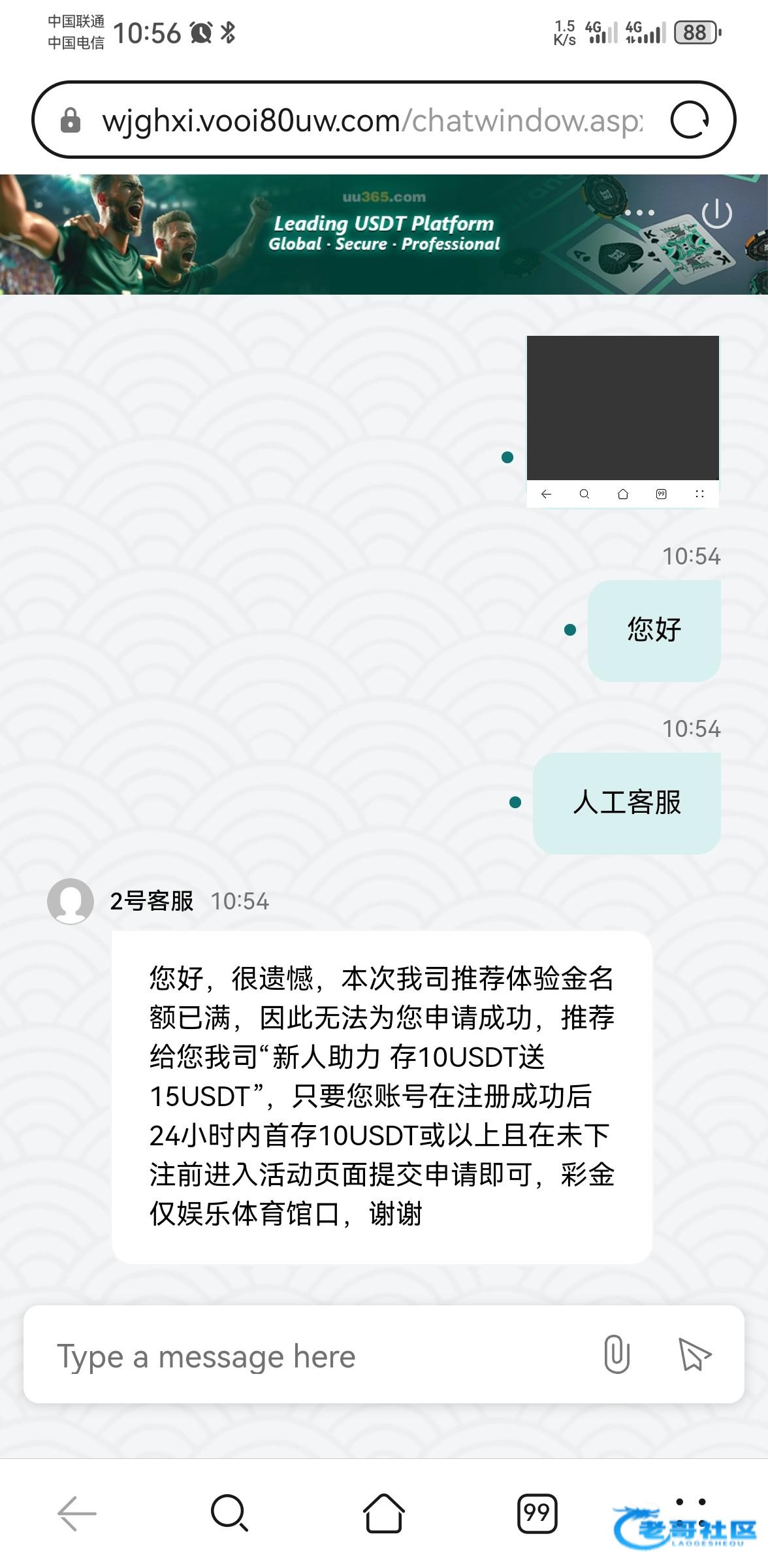 等了几十分钟才回复, 您好,很遗憾,本次我司推荐体验金名额已满,因此无法为您申请成功,推荐给您我司“新人助力 存10USDT送15USDT”,只要您账号在注册成功后24小时内首存10USDT或以上且在未下注前进入活动页面提交申请即可,彩金仅娱乐体育馆口,谢谢