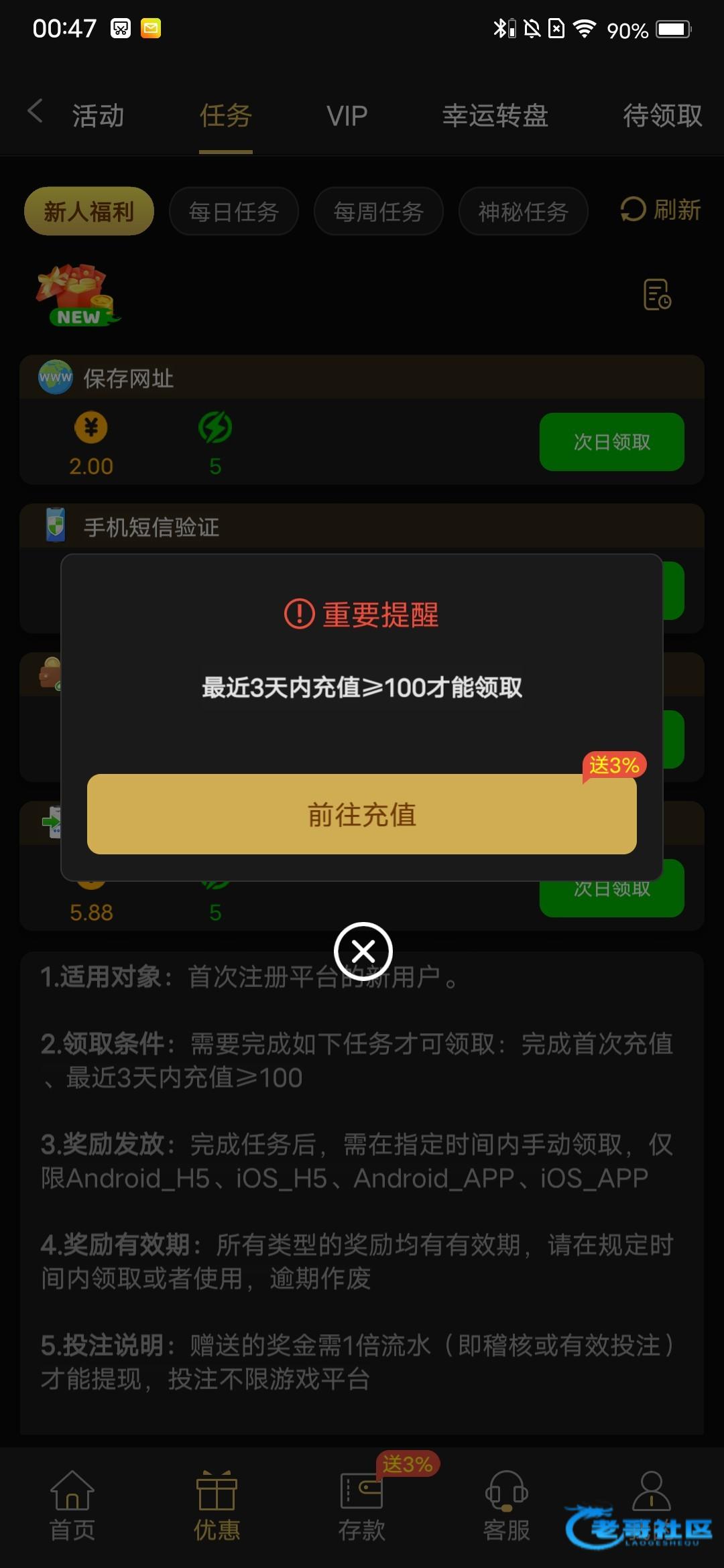 先绑定好了,第2天可以领任务彩金了 再充10块 然后差不多有个30块钱 直接充10块进去,百分之八九十是送狗庄